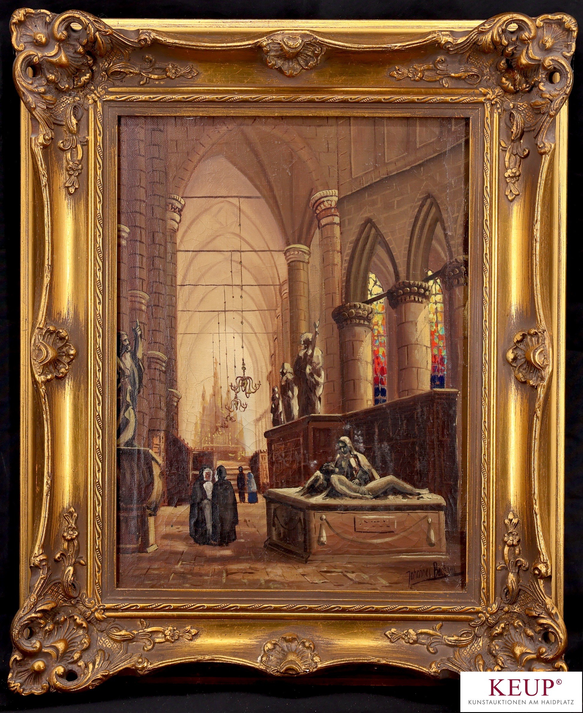 Gemälde - wohl Niederlande Ende 19.Jahrhundert ''Interieur Kathedrale'', undeutlich signiert (Johannes Bo......), Öl auf Leinwand, Maße Darstellung 40x30 cm, Altersspuren (u.a. Krakelee, Fehlstellen), Rahmen, Gesamtmaße ca. 55x45 cm, Provenienz: Privatbesitz Niederbayern