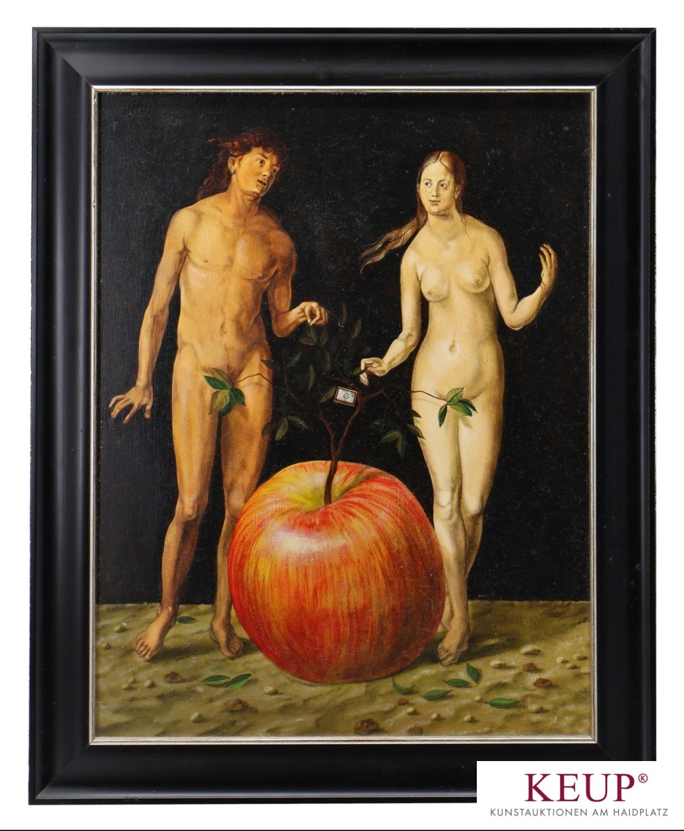 Gemälde - Gerhard Prechtl (1951 - 2024 Regensburg) ''Adam und Eva, in neuer Interpretation zu dem Gemälde von Hans Baldung Grien um 1520'', monogrammiert, Öl auf Hartfaserplatte, Maße Darstellung ca. 56x73 cm, Provenienz: Privatbesitz Regensburg (im Regensburger Kunsthandel erworben - rückseitig beschriftet 1978), vgl. Lit. Eine Stadt im Spiegel der Malerei von W. Amann: Maler, Zeichner und Graphiker; Mitglied: BBK Ndb./Opf., Regensburg; Regensburger Gruppe Kunst; Künstlergilde Esslingen; Münchner Künstlergenossenschaft; Verein für Christliche Kunst - Werke (öffentlich): Bayerische Staatsgemäldesammlungen; Universität Regensburg; Landbauämter; Regensburg; Cham; Amberg; Kinderklinik; Wandgemälde, Bleiglasfenster,