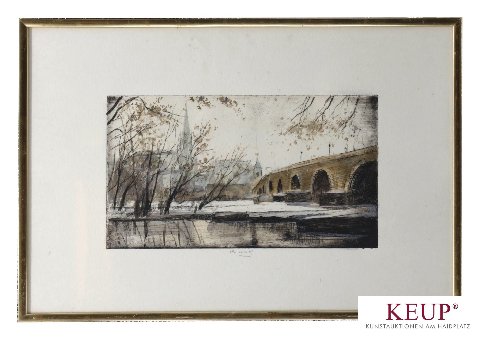 Aquarell über Radierskizze - Gerhard Prechtl (1951 Regensburg) ''Regensburg im Winter'', Bleistiftsignatur, Maße Darstellung ca. 15x28 cm, Rahmen, Provenienz: Privatsammlung Regensburg, vgl. Lit. Eine Stadt im Spiegel der Malerei von W. Amann: Maler, Zeichner und Graphiker; Mitglied: BBK Ndb./Opf., Regensburg; Regensburger Gruppe Kunst; Künstlergilde Esslingen; Münchner Künstlergenossenschaft; Verein für Christliche Kunst - Werke (öffentlich): Bayerische Staatsgemäldesammlungen; Universität Regensburg; Landbauämter; Regensburg; Cham; Amberg; Kinderklinik; Wandgemälde, Bleiglasfenster,