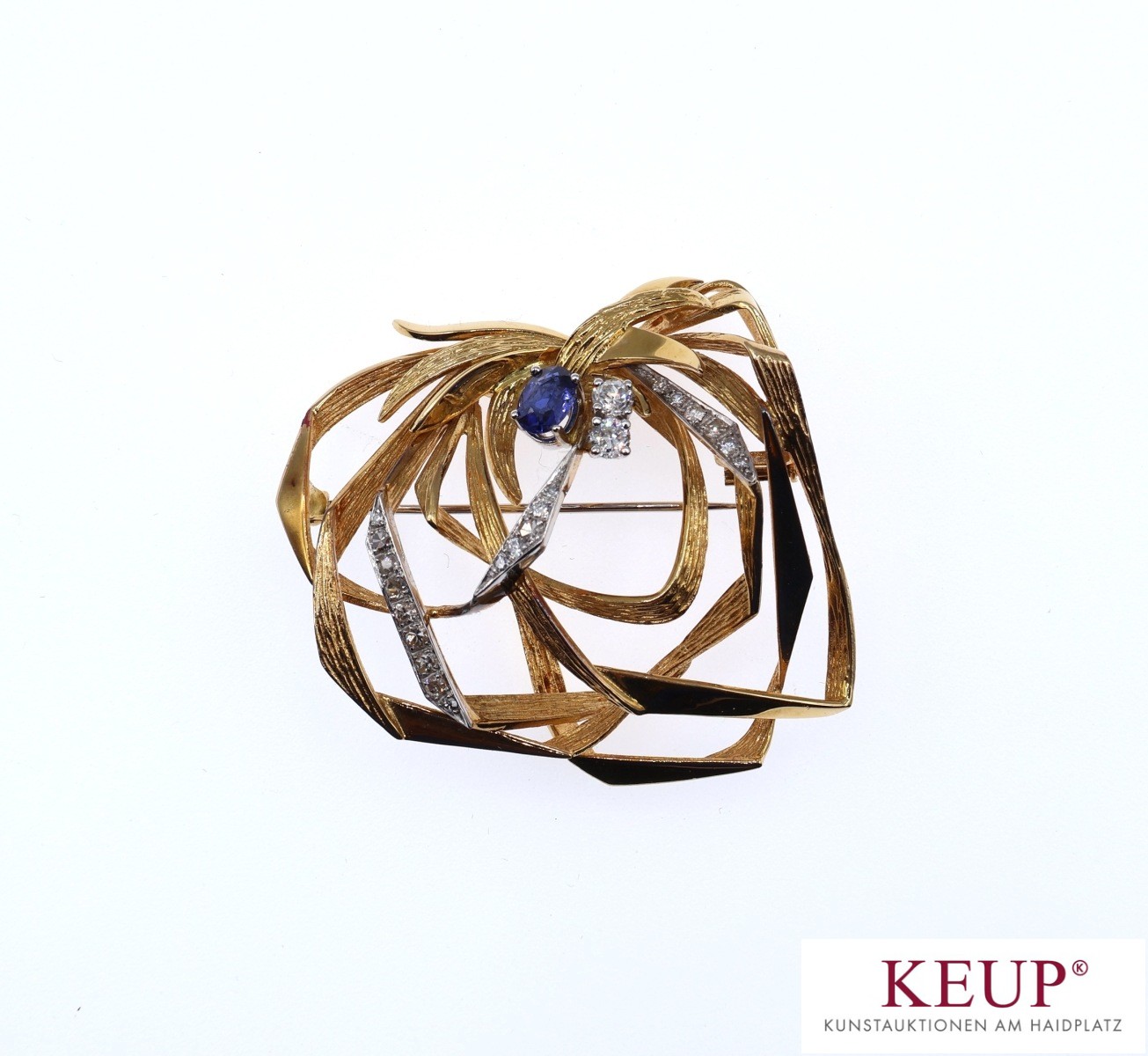 Goldene Brosche - XX.Jahrhundert mit 21 Brillanten und Saphir, Gelbgold gest. 750, Hersteller GL Stern, Blattdekor, ca. 25 Gramm, Provenienz: Privatbesitz Regensburg