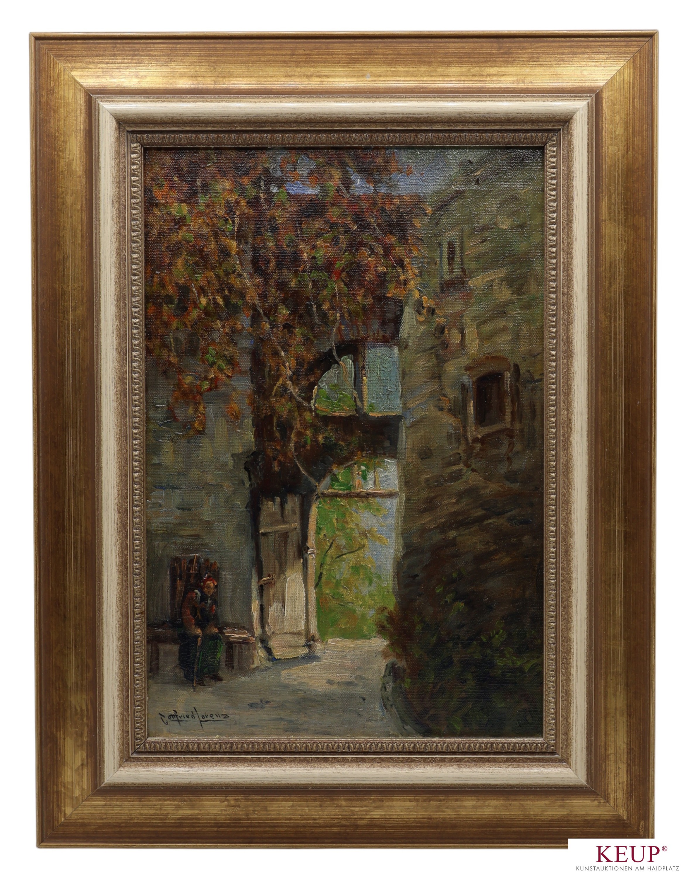 Gemälde - Gottfried Lorenz (Czaba 1860-1928 Wien) ''Historischer Innenhof mit Reisigsammlerin'', l.u. signiert, Öl auf Leinwand / Platte, Maße Darstellung ca. 27x18,5 cm, Rahmen, Provenienz: Privatbesitz Oberbayern, vgl. Lit.: deutsch-österreichischer Maler;