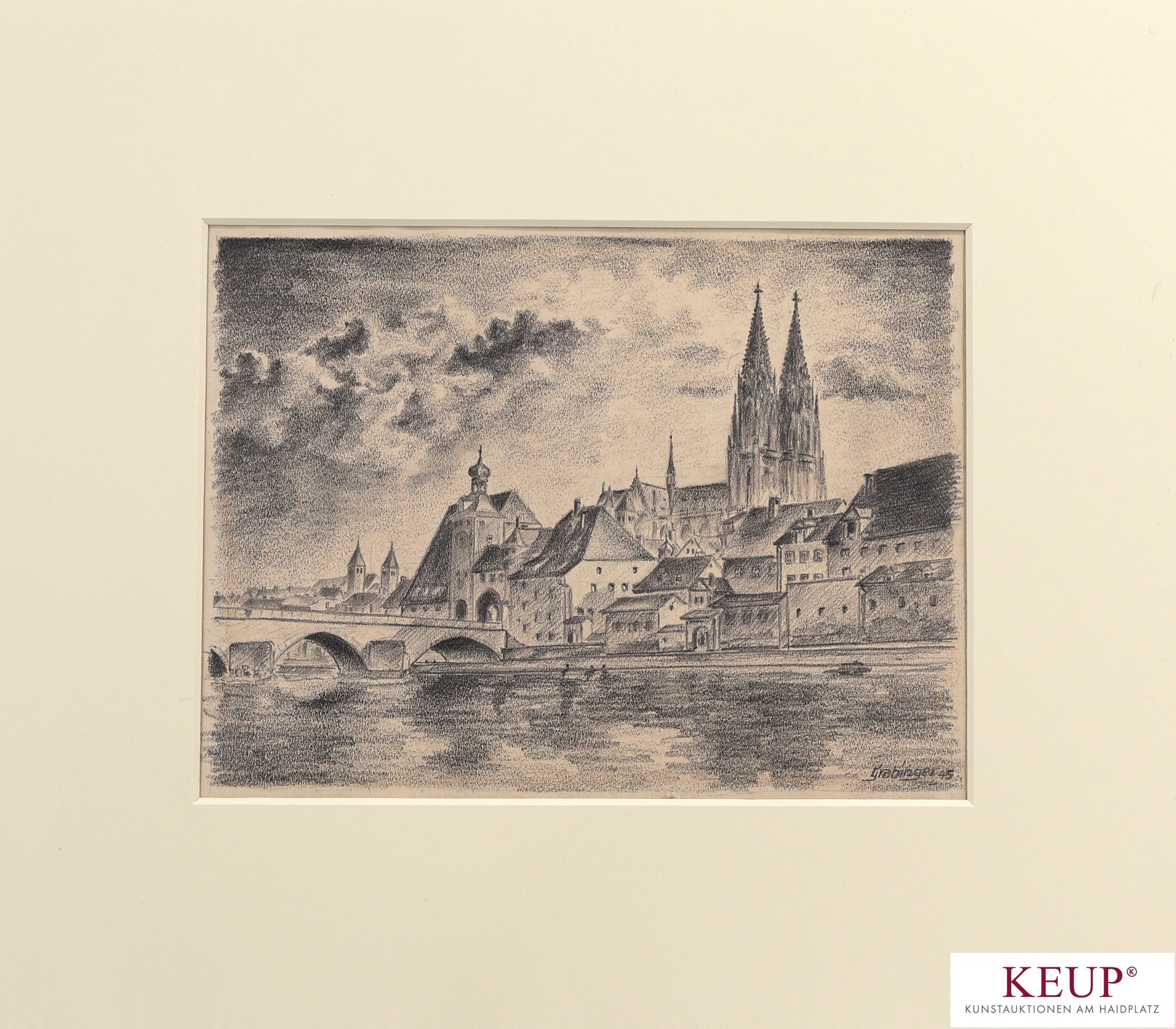 Zeichnung - Grabinger (XX.Jahrhundert) ''Regensburg'', r.u. signiert und datiert (19)45, Bleistift auf Papier, Maße Darstellung ca. 16x22 cm, Passepartout, Provenienz: Regensburg