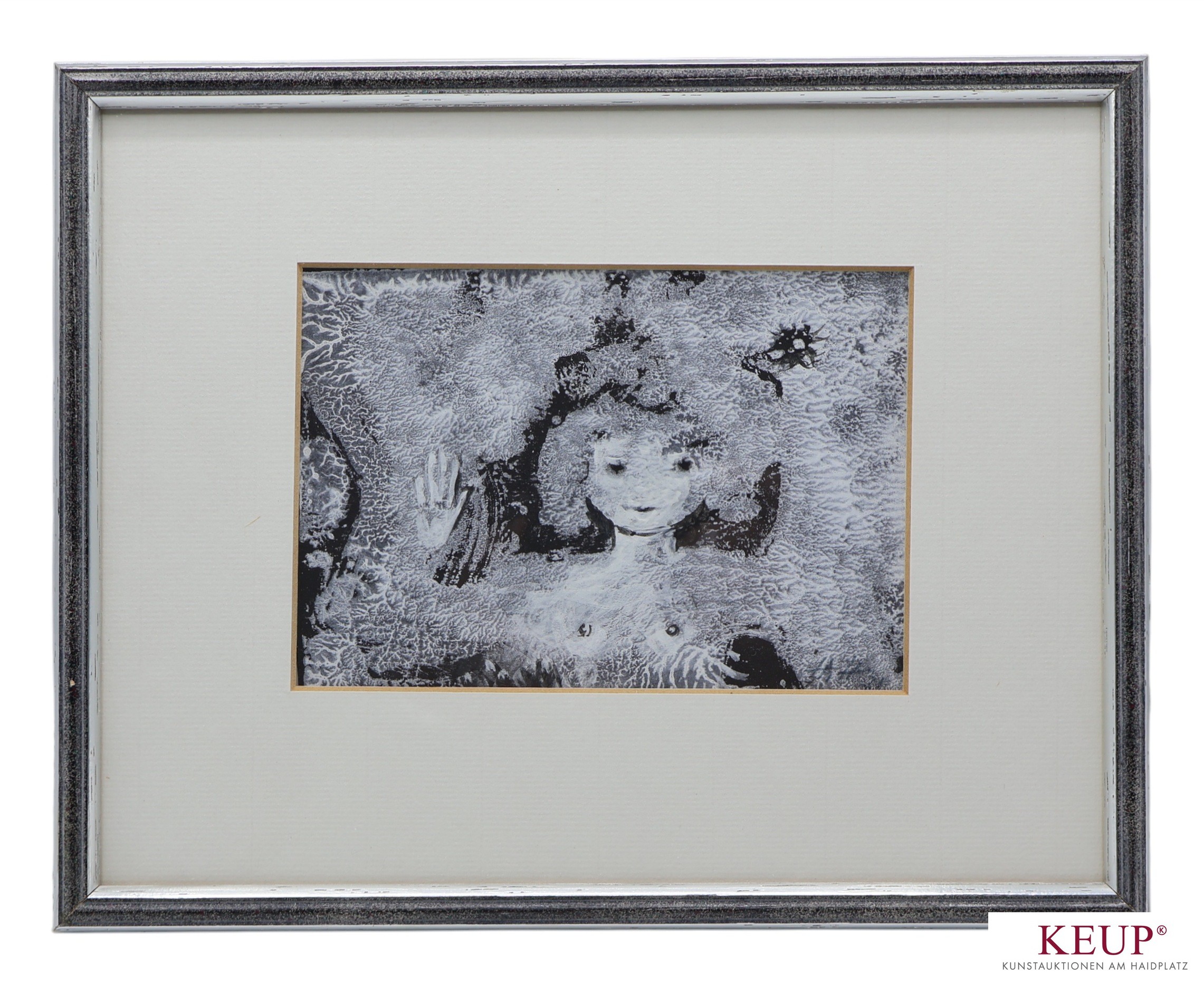 Monotypie - Hannah HÖCH (1889 Gotha -1978 Berlin) ''Eisblumen-Mädchen'', monogrammiert und datiert 71, Tusche und Monotypie auf Papier, Maße ca. 10x14,5 cm, Rahmen, Provenienz: Privatbesitz Oberbayern, vgl.Lit.: deutsche Malerin, Grafikerin und Collagekünstlerin des Dadaismus;