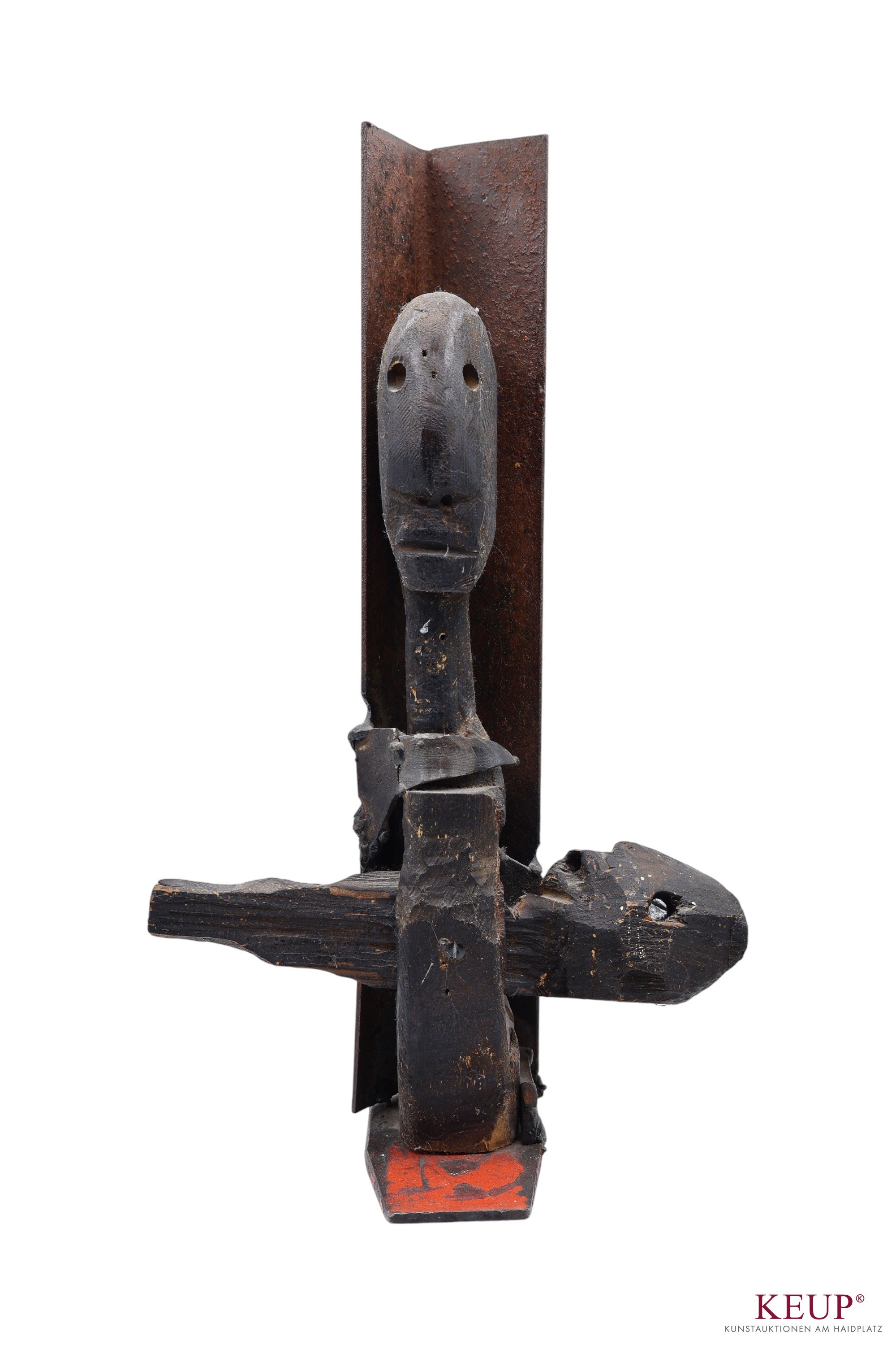 Figur - Hans Jürgen Bröckl (1956 Flossenbürg in der Oberpfalz) ''Ohne Titel'', signiert, Holz/Metall, Höhe ca. 40,5 cm, Provenienz: Private Kunstsammlung Oberpfalz, vgl. Lit.www.broeckl-art.com: 1979-1984 Studium der Malerei und Graphik an der Kunsthochschule Kassel bei den Prof. Kurt Hauck, Manfred Bluth und Nickl; seit 1984 freischaffender Künstler in seiner Heimatgemeinde Flossenbürg, Gruppenausstellungen: 1981 Kunstverein Kassel,1983''Junger Westen'' Recklinghausen 1984 Haus der Kunst München,1987Aktionsraum Sandershäuser-Straße Kassel,1990 Diözesanmuseum Regensburg 1992 Runtingerhaus Regensburg,1993 Diözesanmuseum Regensburg, Einzelausstellungen: 1983 Galerie Hammer Weiden 1985 Kunstraum Hafens-Straße Kassel, 1987 Galerie Ulrich Berr Weiden,1988 Aktionsraum Sandershäuser-Straße Kassel 1991/92/93 Galerie Albrecht Regensburg,1997 Raiffeisenbank Flossenbürg, 2000 Krankenhaus Burglengenfeld, 2002 Kunstverein Weiden, 2008 Atelier & Galerie Dinnes St. Johann - Pfatter, 2019 fairKULTURcafé e.V. Neumarkt/Opf..