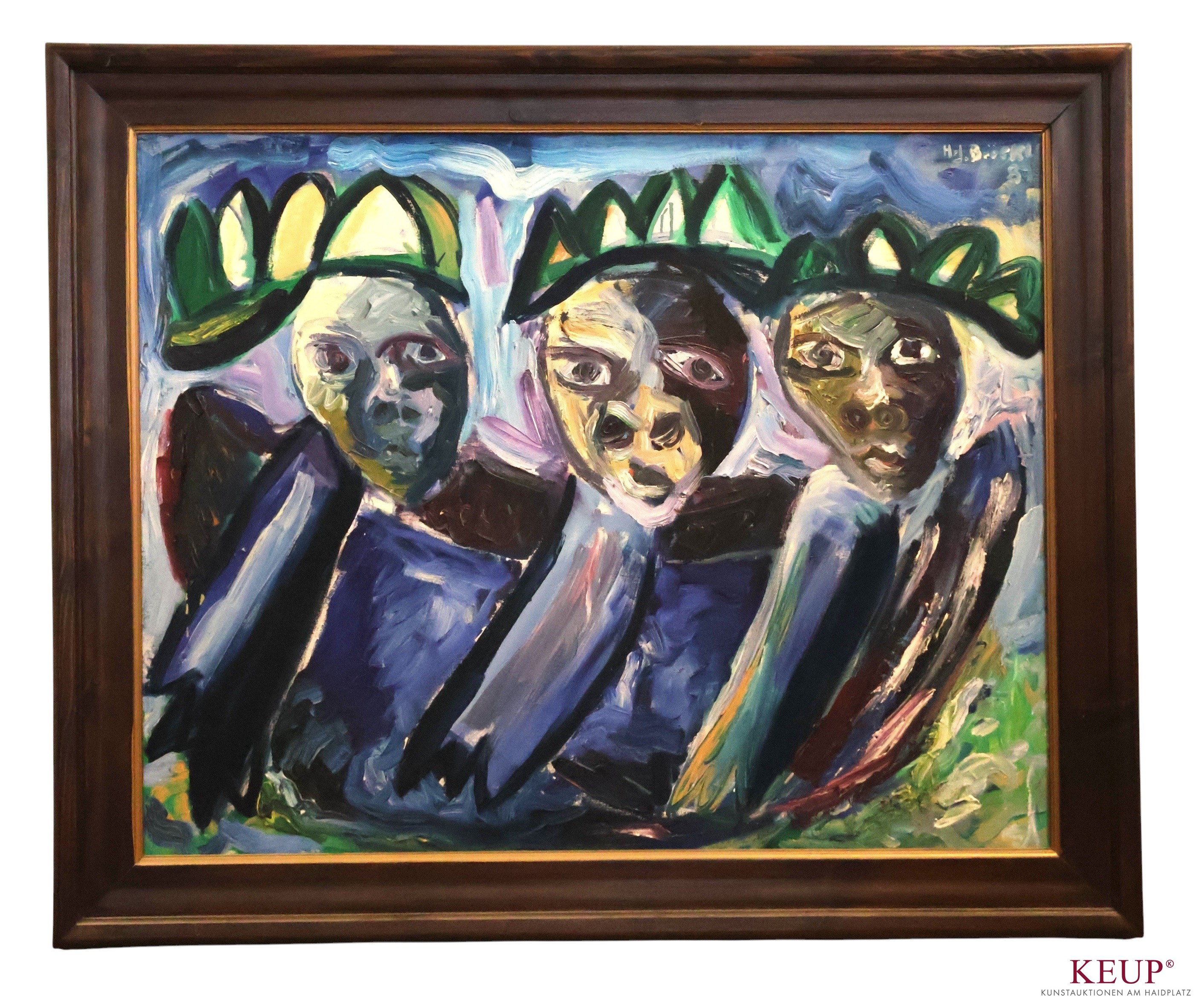 Großes Gemälde - Hans Jürgen Bröckl (1956 Flossenbürg in der Oberpfalz) ''Köpfe'', signiert, datiert 87, Öl auf Leinwand, Maße Darstellung ca. 75x94 cm, Rahmen, Gesamtmaße ca. 93x111 cm, Provenienz: Private Kunstsammlung Oberpfalz, vgl. Lit.www.broeckl-art.com: 1979-1984 Studium der Malerei und Graphik an der Kunsthochschule Kassel bei den Prof. Kurt Hauck, Manfred Bluth und Nickl; seit 1984 freischaffender Künstler in seiner Heimatgemeinde Flossenbürg, Gruppenausstellungen: 1981 Kunstverein Kassel,1983''Junger Westen'' Recklinghausen 1984 Haus der Kunst München,1987Aktionsraum Sandershäuser-Straße Kassel,1990 Diözesanmuseum Regensburg 1992 Runtingerhaus Regensburg,1993 Diözesanmuseum Regensburg, Einzelausstellungen: 1983 Galerie Hammer Weiden 1985 Kunstraum Hafens-Straße Kassel, 1987 Galerie Ulrich Berr Weiden,1988 Aktionsraum Sandershäuser-Straße Kassel 1991/92/93 Galerie Albrecht Regensburg,1997 Raiffeisenbank Flossenbürg, 2000 Krankenhaus Burglengenfeld, 2002 Kunstverein Weiden, 2008 Atelier & Galerie Dinnes St. Johann - Pfatter, 2019 fairKULTURcafé e.V. Neumarkt/Opf..