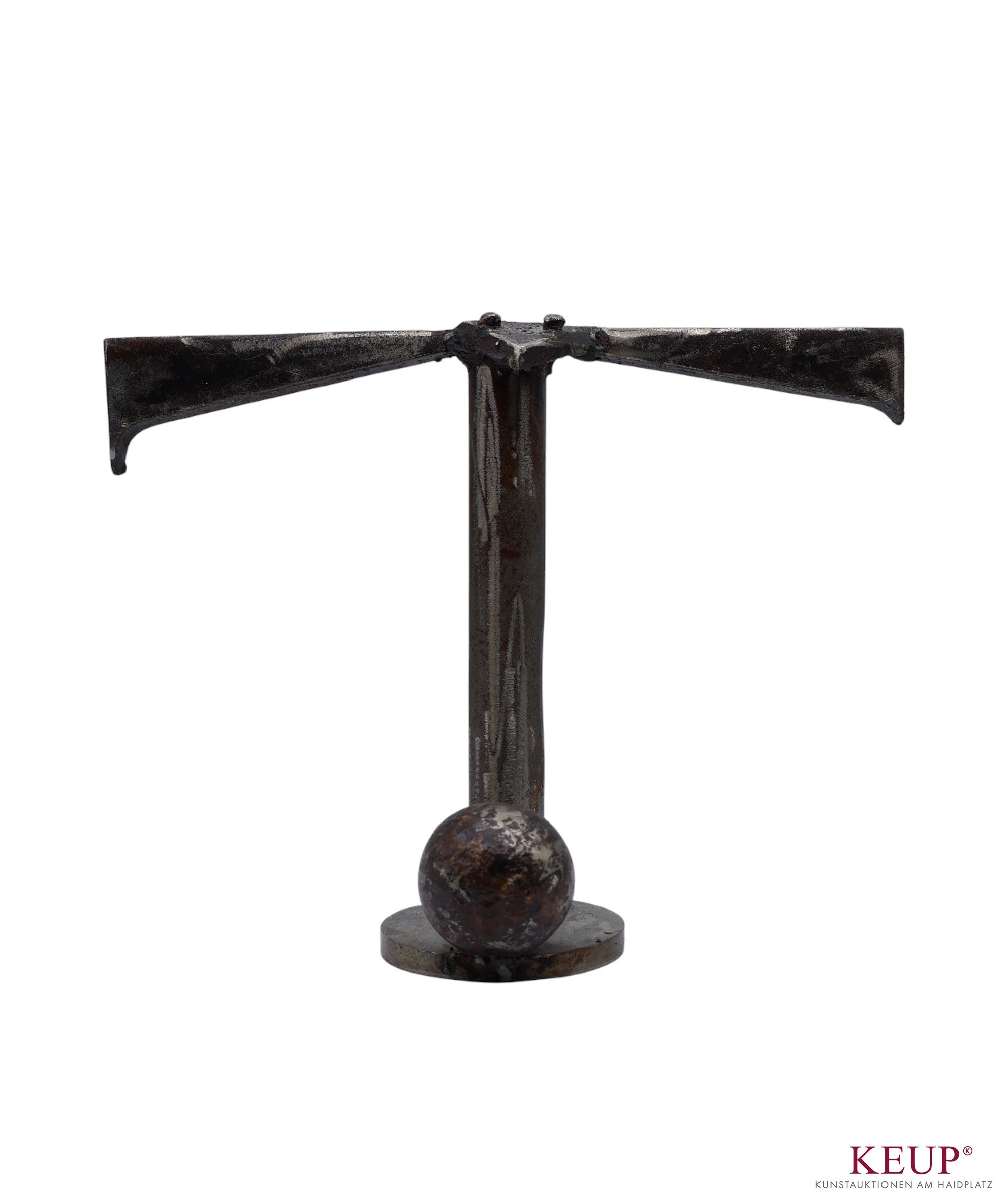 Figur - Hans Jürgen Bröckl (1956 Flossenbürg in der Oberpfalz) ''Ohne Titel'', Metall, Maße ca. 22x28 cm, Provenienz: Private Kunstsammlung Oberpfalz, vgl. Lit.www.broeckl-art.com: 1979-1984 Studium der Malerei und Graphik an der Kunsthochschule Kassel bei den Prof. Kurt Hauck, Manfred Bluth und Nickl; seit 1984 freischaffender Künstler in seiner Heimatgemeinde Flossenbürg, gruppenausstellungen: 1981 Kunstverein Kassel,1983''Junger Westen'' Recklinghausen 1984 Haus der Kunst München,1987Aktionsraum Sandershäuser-Straße Kassel,1990 Diözesanmuseum Regensburg 1992 Runtingerhaus Regensburg,1993 Diözesanmuseum Regensburg, Einzelausstellungen: 1983 Galerie Hammer Weiden 1985 Kunstraum Hafens-Straße Kassel, 1987 Galerie Ulrich Berr Weiden,1988 Aktionsraum Sandershäuser-Straße Kassel 1991/92/93 Galerie Albrecht Regensburg,1997 Raiffeisenbank Flossenbürg, 2000 Krankenhaus Burglengenfeld, 2002 Kunstverein Weiden, 2008 Atelier & Galerie Dinnes St. Johann - Pfatter, 2019 fairKULTURcafé e.V. Neumarkt/Opf..