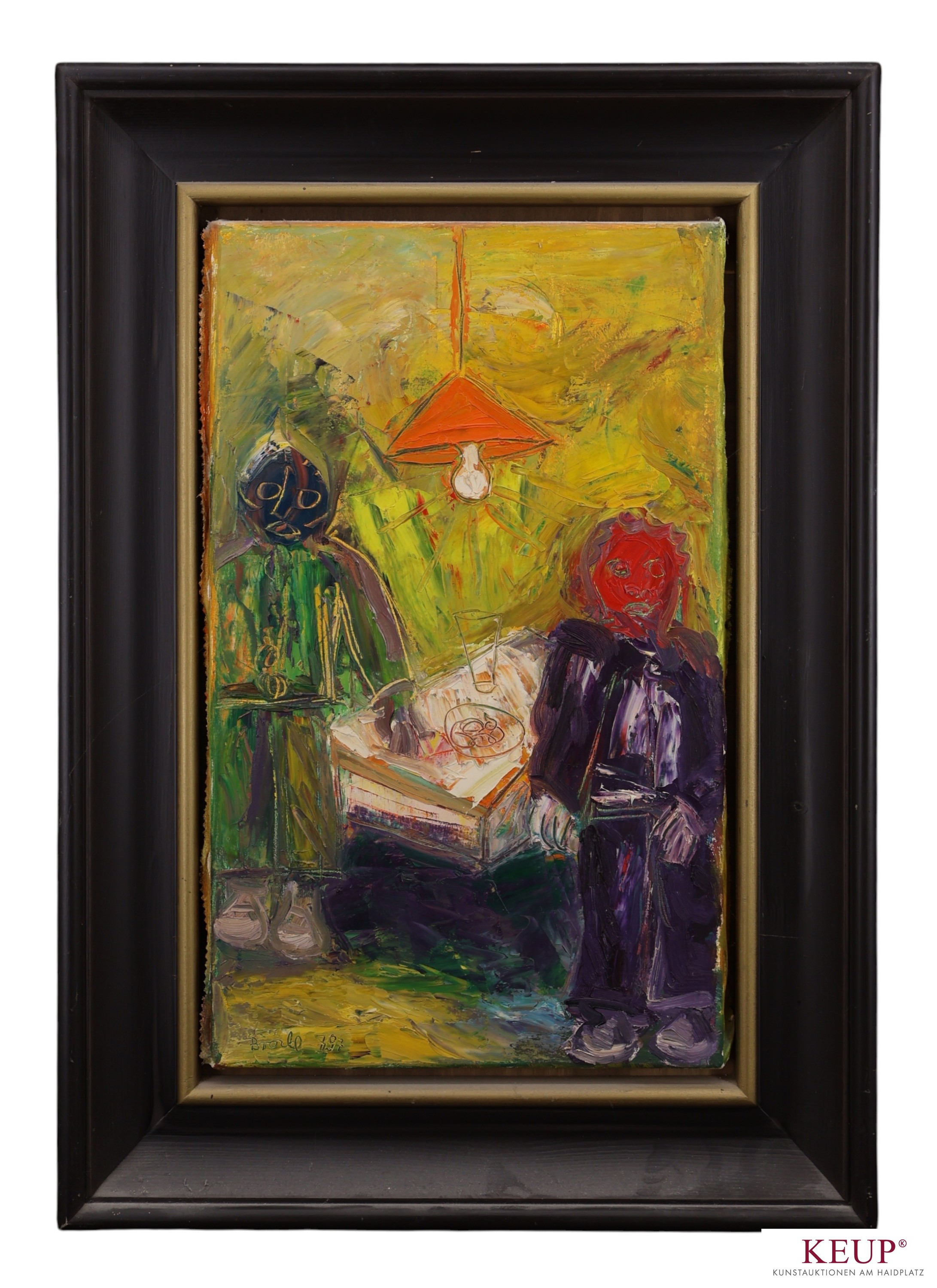 Gemälde - Hans Jürgen Bröckl (1956 Flossenbürg in der Oberpfalz) ''Kopf, signiert, datiert 7992, Öl auf Leinwand, Maße Darstellung ca. 50x30 cm, Rahmen, Gesamtmaße ca. 70x47 cm, Provenienz: Private Kunstsammlung Oberpfalz, vgl. Lit.www.broeckl-art.com: 1979-1984 Studium der Malerei und Graphik an der Kunsthochschule Kassel bei den Prof. Kurt Hauck, Manfred Bluth und Nickl; seit 1984 freischaffender Künstler in seiner Heimatgemeinde Flossenbürg, Gruppenausstellungen: 1981 Kunstverein Kassel,1983''Junger Westen'' Recklinghausen 1984 Haus der Kunst München,1987Aktionsraum Sandershäuser-Straße Kassel,1990 Diözesanmuseum Regensburg 1992 Runtingerhaus Regensburg,1993 Diözesanmuseum Regensburg, Einzelausstellungen: 1983 Galerie Hammer Weiden 1985 Kunstraum Hafens-Straße Kassel, 1987 Galerie Ulrich Berr Weiden,1988 Aktionsraum Sandershäuser-Straße Kassel 1991/92/93 Galerie Albrecht Regensburg,1997 Raiffeisenbank Flossenbürg, 2000 Krankenhaus Burglengenfeld, 2002 Kunstverein Weiden, 2008 Atelier & Galerie Dinnes St. Johann - Pfatter, 2019 fairKULTURcafé e.V. Neumarkt/Opf..