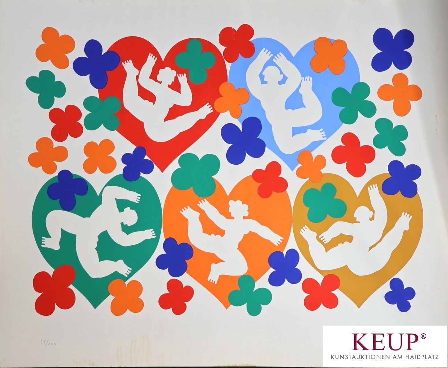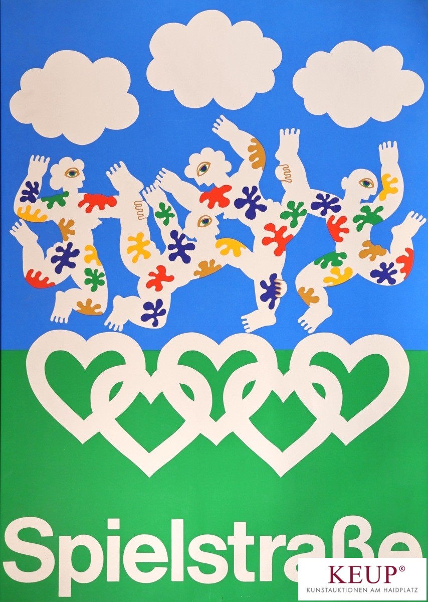 Lot Grafiken - Herbert Schneider (1924 Griesbach im Rottal 1983 Hinterthal) 1. Farblithographie, ''Figürliche Kompositionen'', r.u. signiert, 51/100, fleckig, Maße ca. 56,5x69,5 cm 2.''Plakat Spielstraße zu Olympiade München 1972'', r.u. Bleistiftsignatur, Maße ca. 83,5x61 cm, Altersspuren (u.a. Blattende mit Fehlstellen), Provenienz: Privatbesitz Regensburg, vgl.Lit.: Studium an der Akademie Stuttgart bei Willi Baumeister; 1956 ''Kunstpreis der Jugend''; tätig in der Münchner Kunstszene