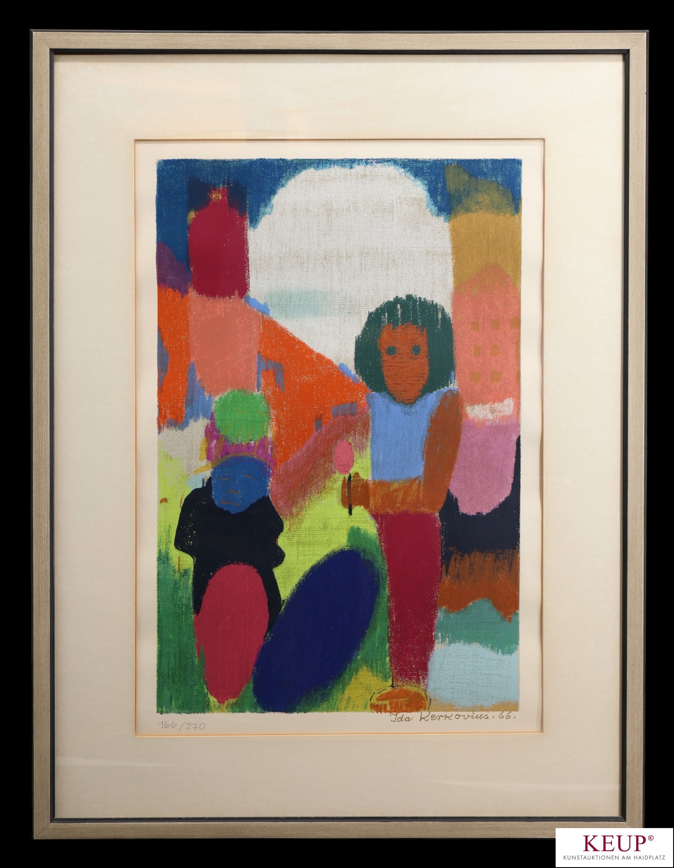 Farbserigraphie - Ida Kerkovius (1879 Riga Russisches Kaiserreich - 1970 Stuttgart) ''Kind mit Luftballons und Lolly'', Platte r.u. signiert und datiert (19)66, Nr. 166/270, Maße Darstellung ca. 46x30 cm, Altersspuren (Rahmen wurde nicht geöffnet), Maße Darstellung ca. 67x50,5 cm, Provenienz: Privatbesitz Landkreis Regensburg, vgl. Lit.: deutsche Malerin und Bildteppichweberin, gehörte zu den bedeutendsten weiblichen Vertreterinnen der Klassischen Moderne in Deutschland; Schülerin von Adolf Hölzel in der Künstlerkolonie Dachau; 1920-23 verbrachte sie die Wintersemester am Bauhaus in Weimar; Die Nationalsozialisten diffamierten ihre Werke als Entartete Kunst; Zahlreiche Ehrungen und Ausstellungen