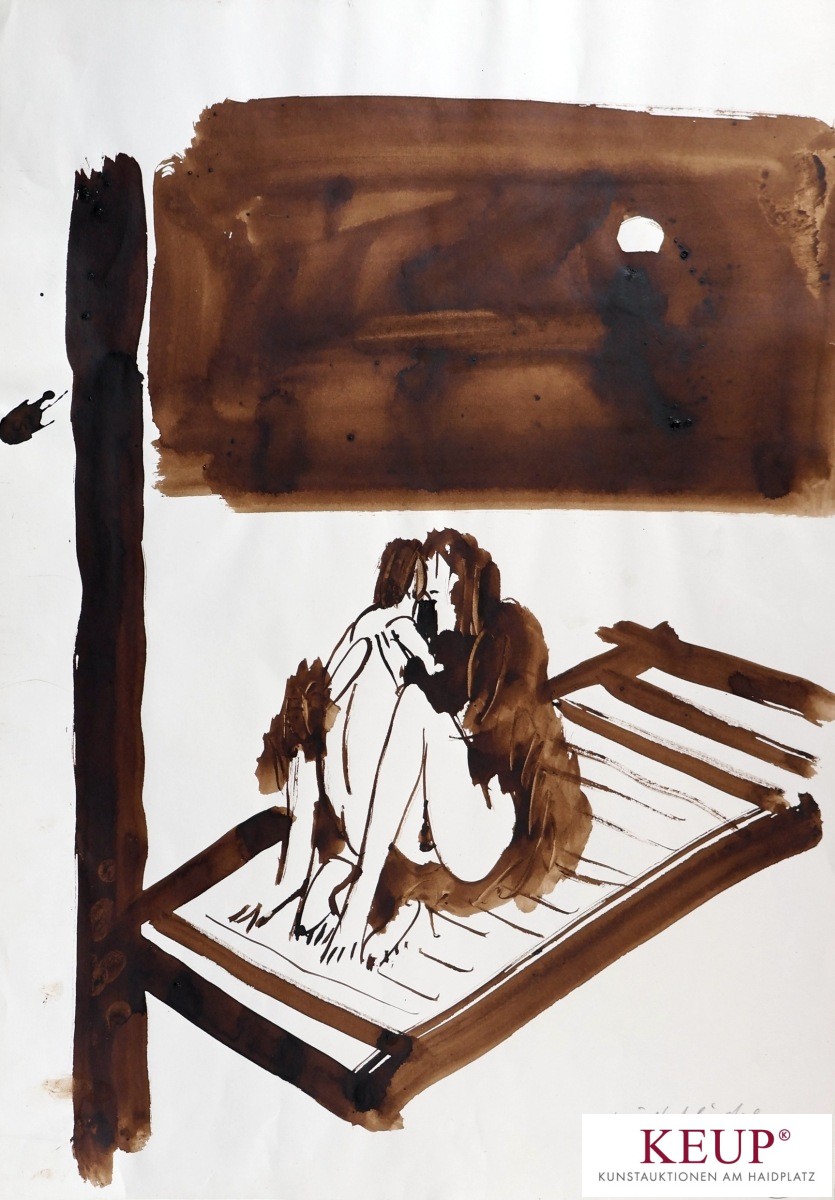 Aquarell - Josef Oberberger (1905 Regensburg - 1994 Kreuth) '' Nächtliche Lyrik '', r.u. monogrammiert, lasierende Farben auf Papier, Blattmaße ca. 61x43 cm, Provenienz: Niederbayern, vgl. Lit.: deutscher Maler, Zeichner, Karikaturist, Glasmaler und Kunstprofessor; 1926-32 Studium an der Akademie Bildende Künste in München, Meisterschüler von Olaf Gulbransson. Begegnung mit dem Simplicissimus-Kreis von Karl Arnold bis Karl Valentin etc.