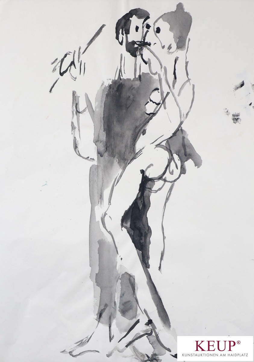 Aquarell - Josef Oberberger (1905 Regensburg - 1994 Kreuth) '' Der Künstler und die Muse '', r.u. monogrammiert, lasierende Farben auf Papier, Blattmaße ca. 42x29,5 cm, Provenienz: Niederbayern, vgl. Lit.: deutscher Maler, Zeichner, Karikaturist, Glasmaler und Kunstprofessor; 1926-32 Studium an der Akademie Bildende Künste in München, Meisterschüler von Olaf Gulbransson. Begegnung mit dem Simplicissimus-Kreis von Karl Arnold bis Karl Valentin etc.