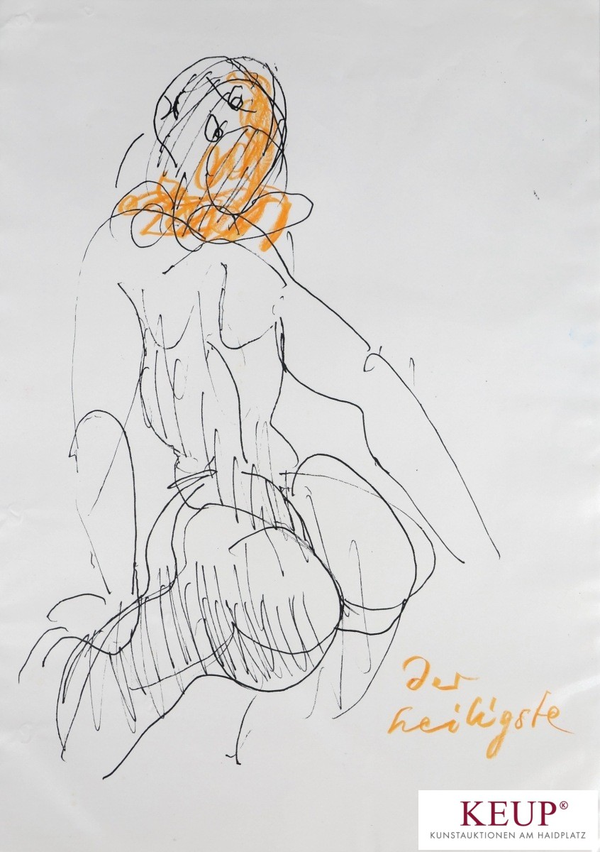 Zeichnung - Josef Oberberger (1905 Regensburg - 1994 Kreuth) '' Der Heiligste'', r.u. monogrammiert, Stift/Kreide auf Glanzpapier, Blattmaße ca. 42x29,5 cm, Altersspuren, Provenienz: Niederbayern, vgl. Lit.: deutscher Maler, Zeichner, Karikaturist, Glasmaler und Kunstprofessor; 1926-32 Studium an der Akademie Bildende Künste in München, Meisterschüler von Olaf Gulbransson. Begegnung mit dem Simplicissimus-Kreis von Karl Arnold bis Karl Valentin etc.