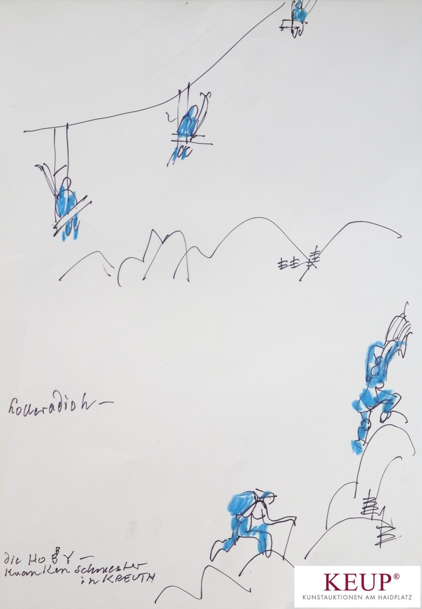 Zeichnung - Josef Oberberger (1905 Regensburg - 1994 Kreuth) '' Die Hobby - Krankenschwester in Kreuth'', Stift/Kreide auf Papier, Blattmaße ca. 42x29,5 cm, Provenienz: Niederbayern, vgl. Lit.: deutscher Maler, Zeichner, Karikaturist, Glasmaler und Kunstprofessor; 1926-32 Studium an der Akademie Bildende Künste in München, Meisterschüler von Olaf Gulbransson. Begegnung mit dem Simplicissimus-Kreis von Karl Arnold bis Karl Valentin etc.