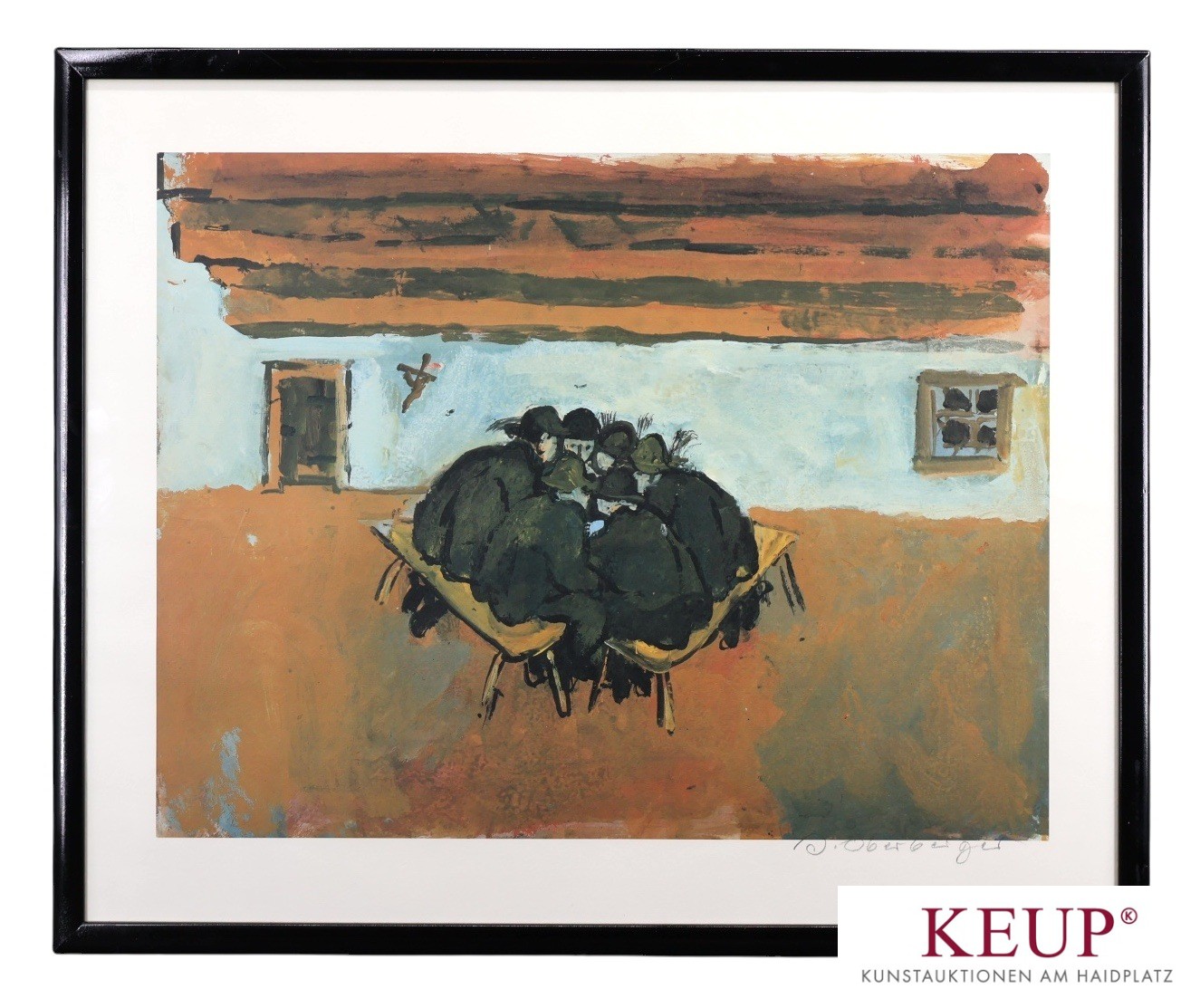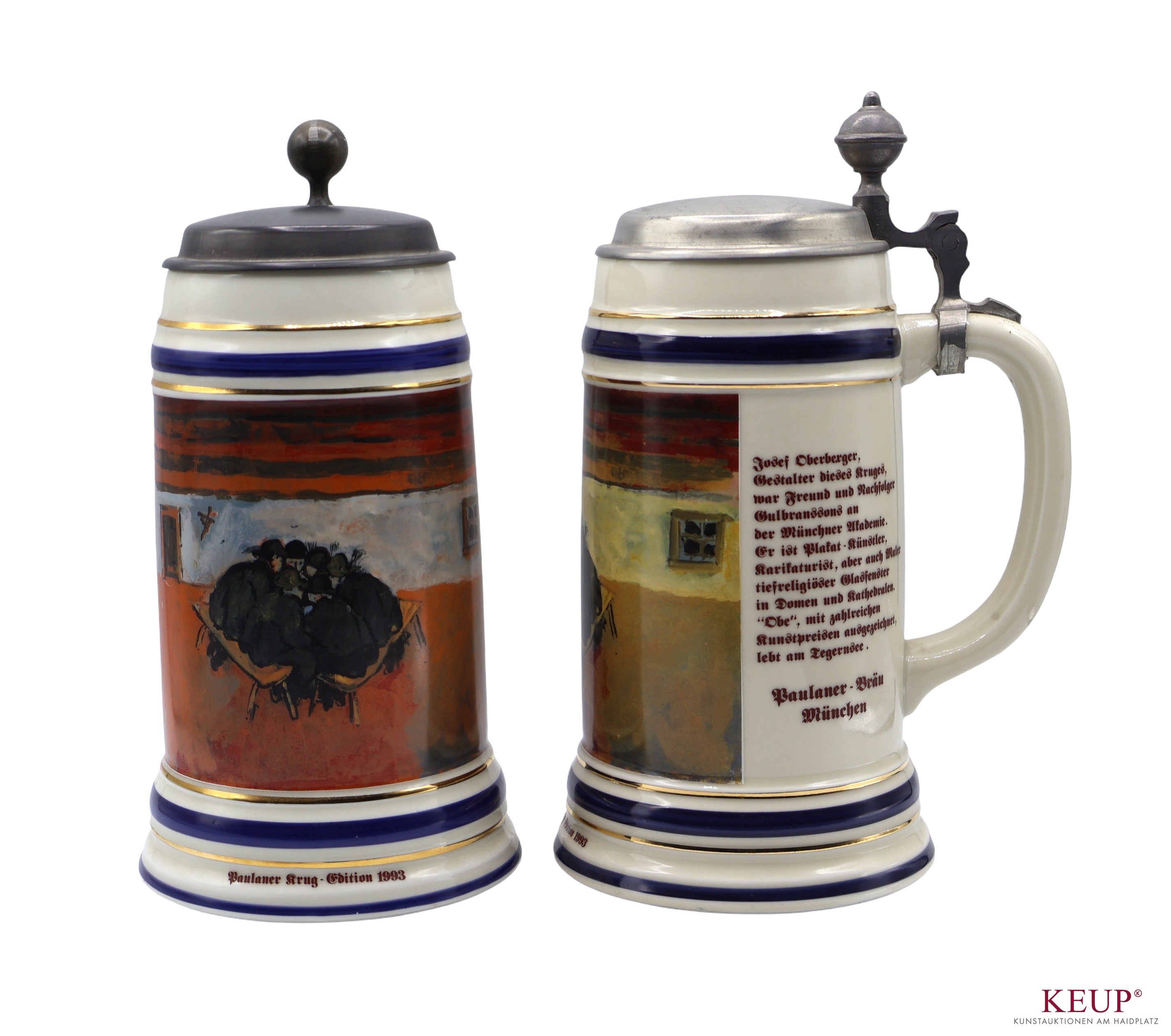 Farboffset - Josef Oberberger (1905 Regensburg - 1994 Kreuth) ''Der Stammtisch'', r.u. Bleistiftsignatur, Blattmaße ca. 43x55 cm, Rahmen, anbei zwei Krüge mit Oberberger Motiv, Paulaner Edition 1993, Provenienz: Privatbesitz Landkreis Regensburg, vgl. Lit.: deutscher Maler, Zeichner, Karikaturist, Glasmaler und Kunstprofessor; 1926-32 Studium an der Akademie Bildende Künste in München, Meisterschüler von Olaf Gulbransson. Begegnung mit dem Simplicissimus-Kreis von Karl Arnold bis Karl Valentin etc.