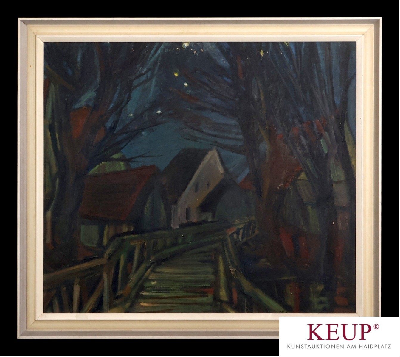 Gemälde - Josef Georg Miller (1905 Augsburg - 1983 Kallmünz) ''Nachthimmel mit Sternen, darunter führt ein Holzsteg in den Markt'', unten Mitte. monogrammiert M, datiert (19)45, Öl auf Hartfaser, Maße Darstellung ca. 48,5x56 cm, Provenienz: Privatsammlung Oberpfalz, vgl. Lit.: Studium in Leipzig (Prof. Soltmann) und Stuttgart (Prof. Altherr, Prof. Spiegel), ab 1941 Keramikstudium an der Akademie für angewandte Künste in München, 3 Bilder wurden in der Zeit des Nationalsozialismus aus dem Museum der bildenden Künste in Leipzig entfernt, ab 1946 Mitglied im Berufsverband der Bildenden Künstler Regensburg,