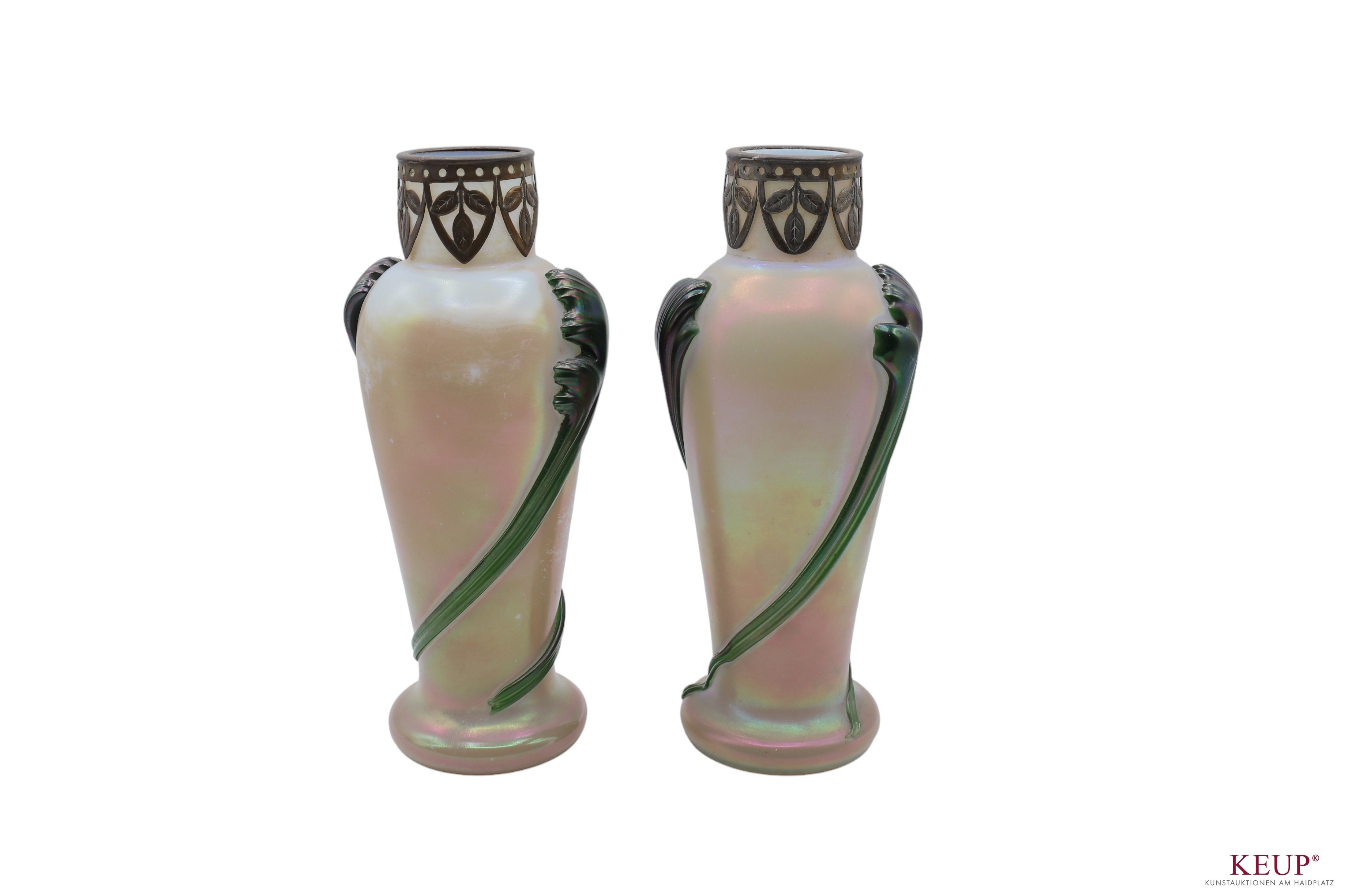 Paar Vasen - wohl Kralik Böhmen nach 1900 lystrierendes Glas mit grünen Aufschmelzungen, Metallmontierung, Höhe ca. 23,5 cm, 2 Stück, Provenienz: Privatbesitz Regensburg