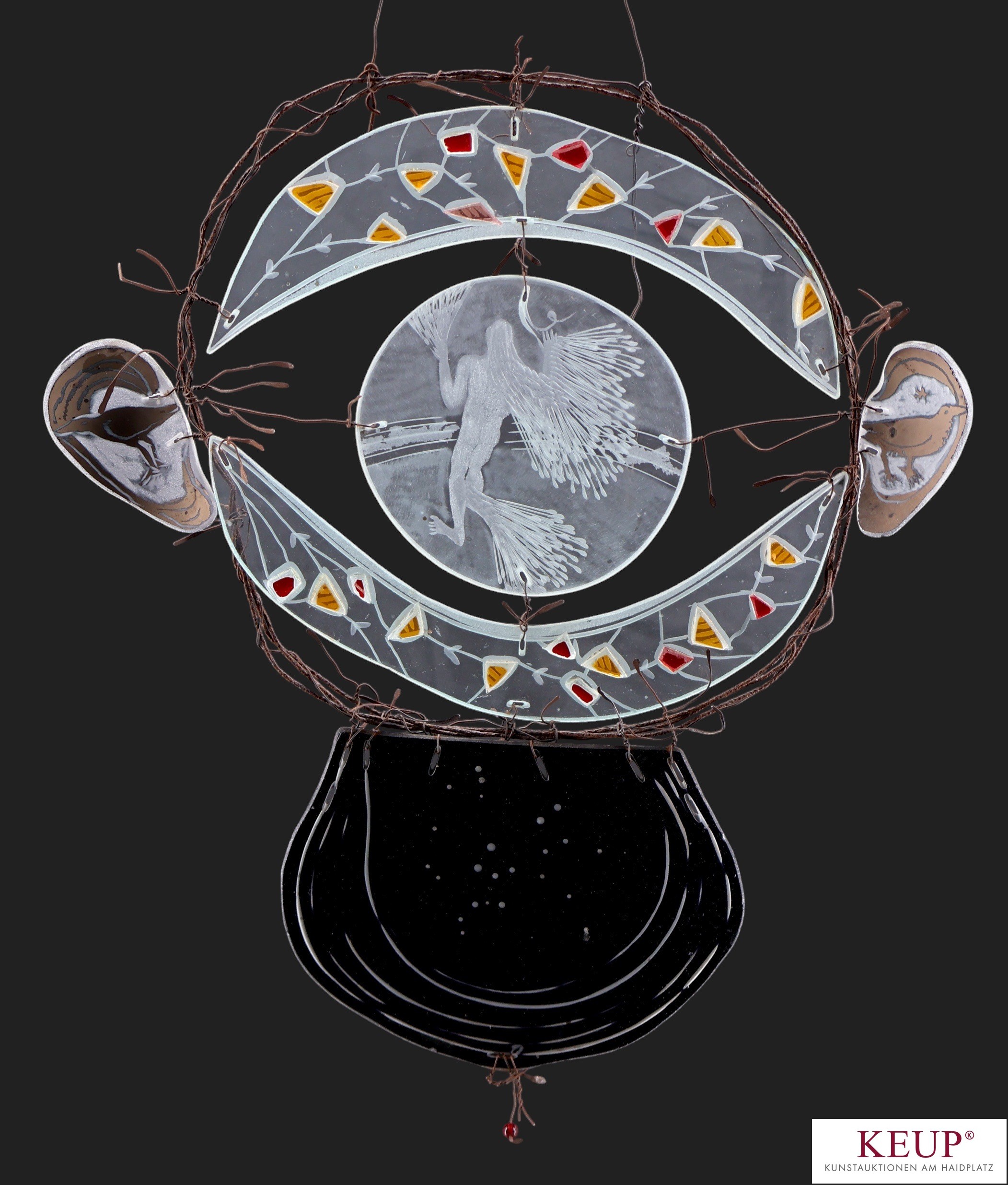 Glasobjekt - Karin Hubert (1939 Holzminden -2020) ''Ohne Titel'', Scherbengeschichte mit Glas und Draht, geätzte Figurenstaffage, Altersspuren, Maße ca.40x35 cm, Provenienz: Private Kunstsammlung Oberpfalz, vgl. Lit.: bedeutende Glasgestalterin der Studioglasszene; Ausbildung in Zwiesel, Studium der Bildhauerei an der Akademie der Bildenden Künste in München; Mentor Erwin Eisch aus Frauenau /Bayerwald; siehe u.a. ''Neues Glas'' und Sonderausstellung 2021 im LWL-Industriemuseum Glashütte Gernheim in Petershagen