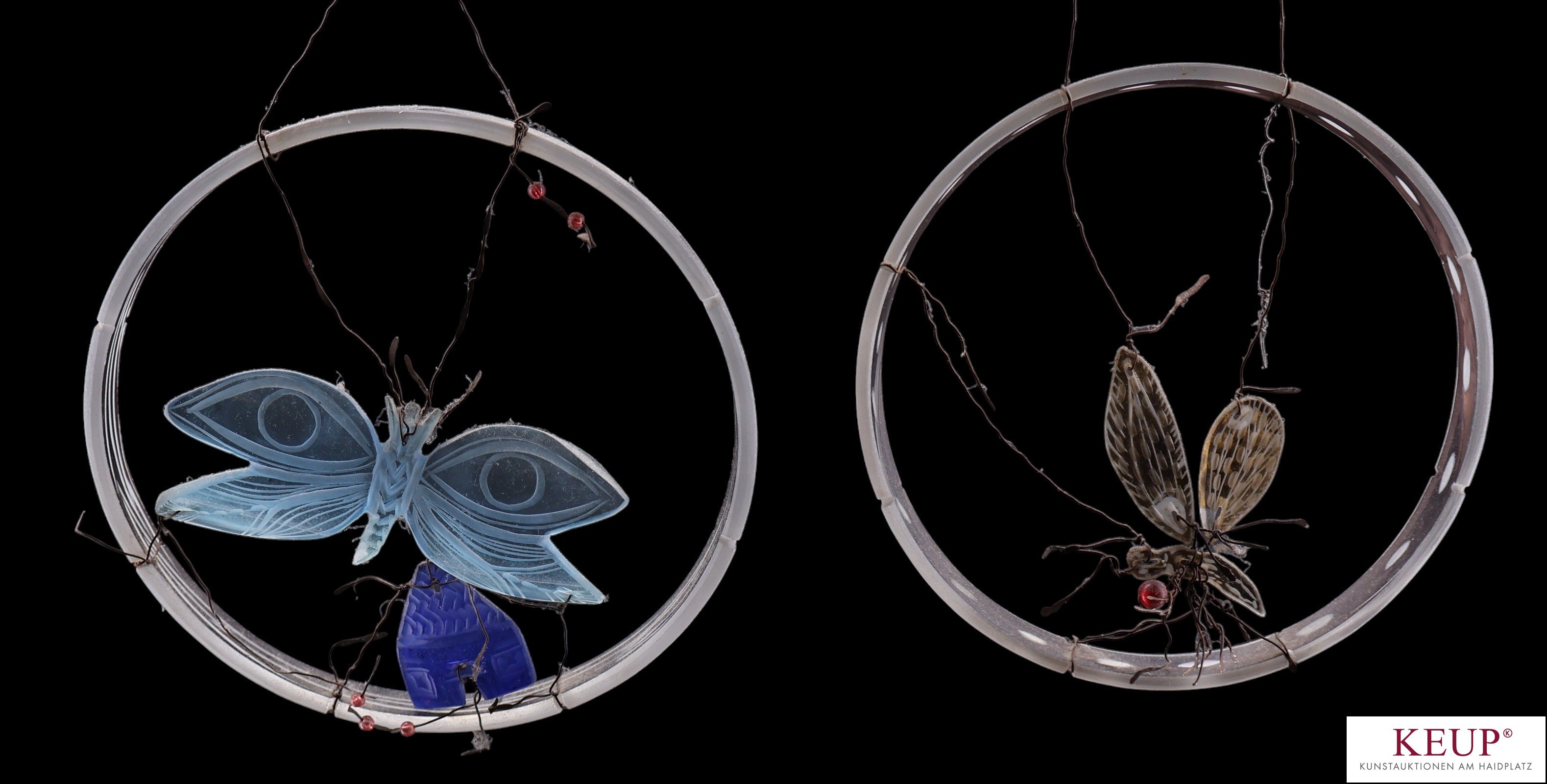 Paar Glasobjekte - Karin Hubert (1939 Holzminden -2020) ''Ohne Titel'', Scherbengeschichte mit Glas und Draht, Altersspuren, Maße ca. d.= ca. 17/18 cm, 2 Stück, Provenienz: Private Kunstsammlung Oberpfalz, vgl. Lit.: bedeutende Glasgestalterin der Studioglasszene; Ausbildung in Zwiesel, Studium der Bildhauerei an der Akademie der Bildenden Künste in München; Mentor Erwin Eisch aus Frauenau /Bayerwald; siehe u.a. ''Neues Glas'' und Sonderausstellung 2021 im LWL-Industriemuseum Glashütte Gernheim in Petershagen