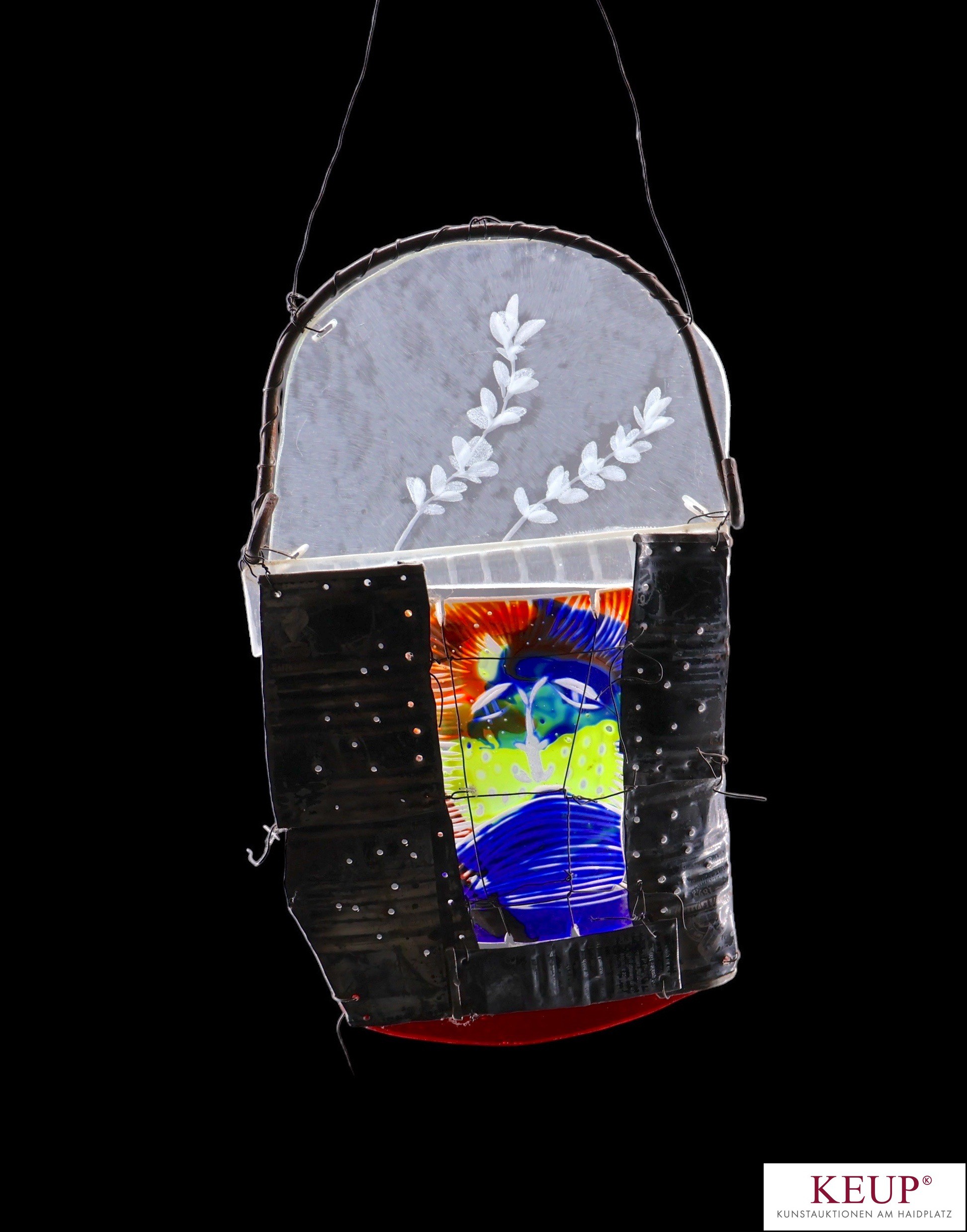 Glasobjekt - Karin Hubert (1939 Holzminden -2020) ''Ohne Titel'', Scherbengeschichte mit Glas und Draht, Blech, Altersspuren, Maße ca.30,5x17,5 cm, Provenienz: Private Kunstsammlung Oberpfalz, vgl. Lit.: bedeutende Glasgestalterin der Studioglasszene; Ausbildung in Zwiesel, Studium der Bildhauerei an der Akademie der Bildenden Künste in München; Mentor Erwin Eisch aus Frauenau /Bayerwald; siehe u.a. ''Neues Glas'' und Sonderausstellung 2021 im LWL-Industriemuseum Glashütte Gernheim in Petershagen
