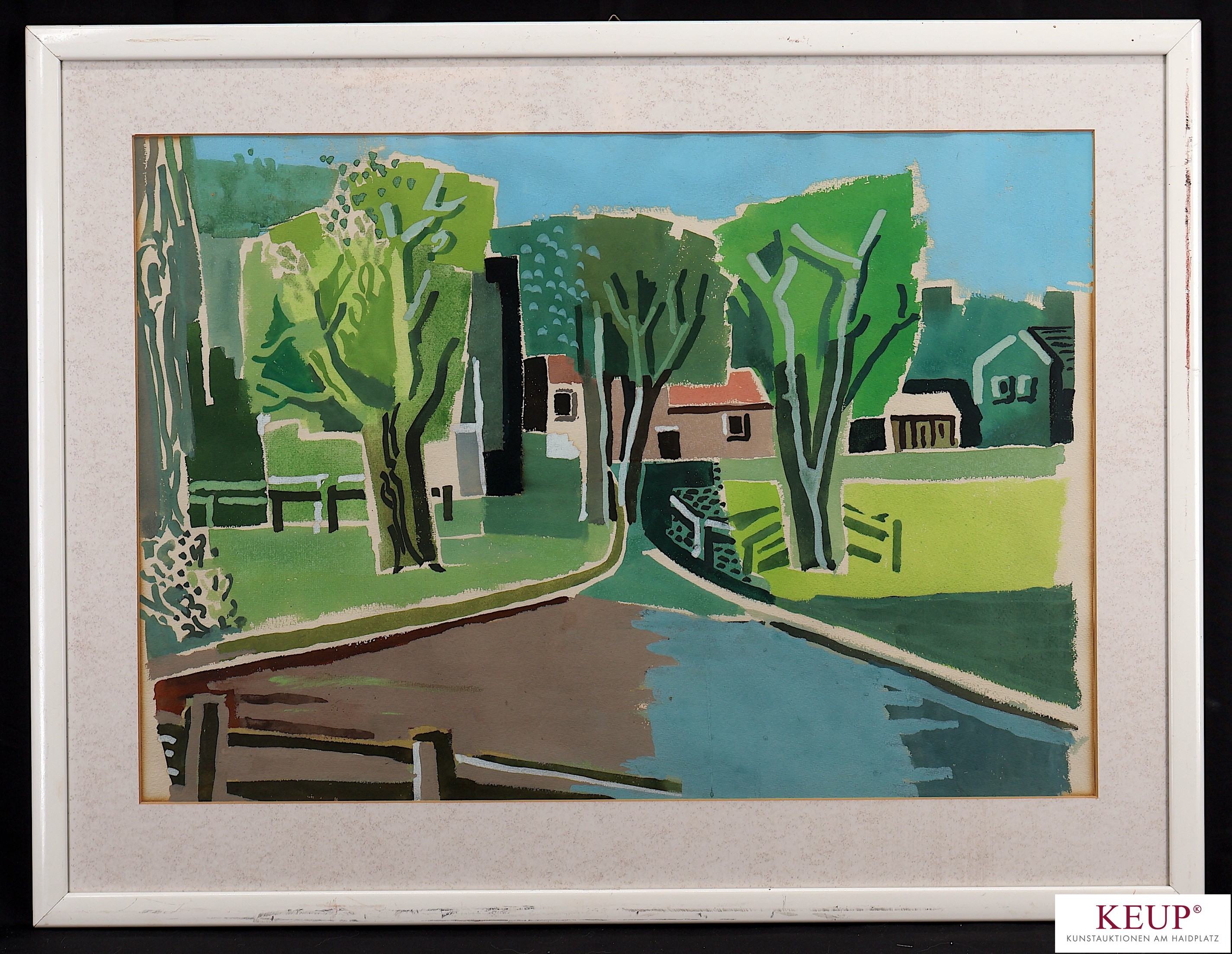 Aquarell - Karl Haberl (1920 Nürnberg) ''Landschaft'', unsigniert, lasierende Farben auf Papier, Maße Darstellung ca. 39x56 cm, Passepartout, Rahmen, Gesamtmaße ca. 53x67 cm, Provenienz: Privatbesitz Regensburg, vgl. Lit. Internet: Studium an der Akademie der bildenden Künste in München, hier später Professor, bekannt für Städteansichten und Seemotive aus dem Oberbayerischen, vertreten in der Sammlung Lenbachhaus München,