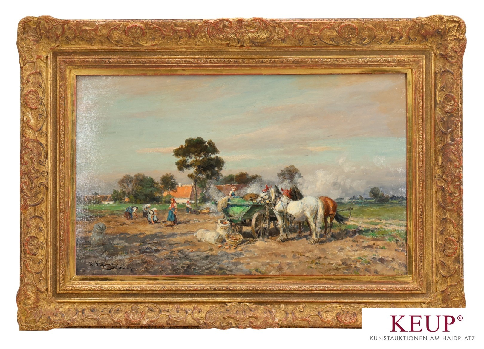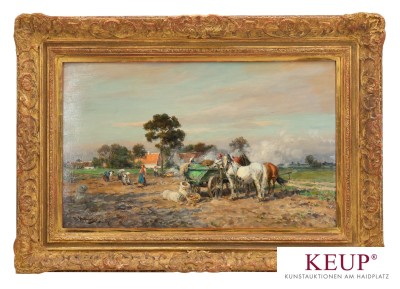 Gemälde - Karl STUHLMÜLLER (1859 München - 1930 Etzenhausen bei Dachau) ''Oberbayerische Landschaft mit Ernteszene, im Vordergrund vier Mägde bei der Kartoffelernte, zwei Mägde an der Feuerstelle und Karren mit Erntegut und drei Pferden'', l.u signiert und bezeichnet München, Öl auf Malerpappe, Maße Darstellung ca. 34,5x56 cm, Goldrahmen, Gesamtmaße ca. 53x75 cm, Provenienz: Privatsammlung Regensburg, vgl. Lit.: Ab 1875 Studium an der Akademie der bildenden Künste München bei Carl Theodor von Piloty; Mitglied der Münchner Künstlergenossenschaft;