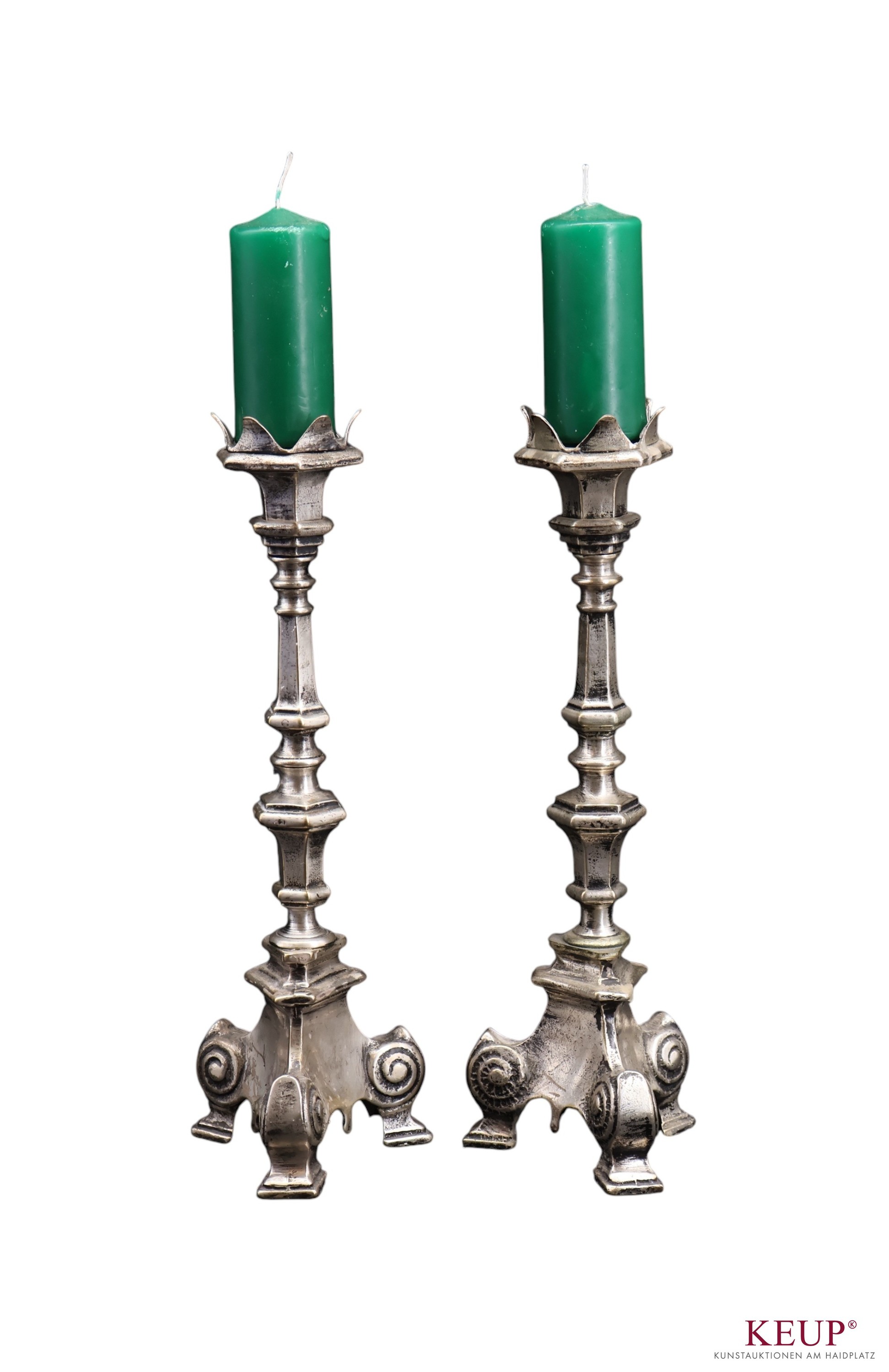 Paar Kerzenleuchter - im Barockstil Messing versilbert, 3-passiger Fuß, unterteilter Mittelsteg, 1-flammig, Höhe ca. 37,5 cm, ca. 3200 Gramm, Provenienz: Privatbesitz Landkreis Regenburg
