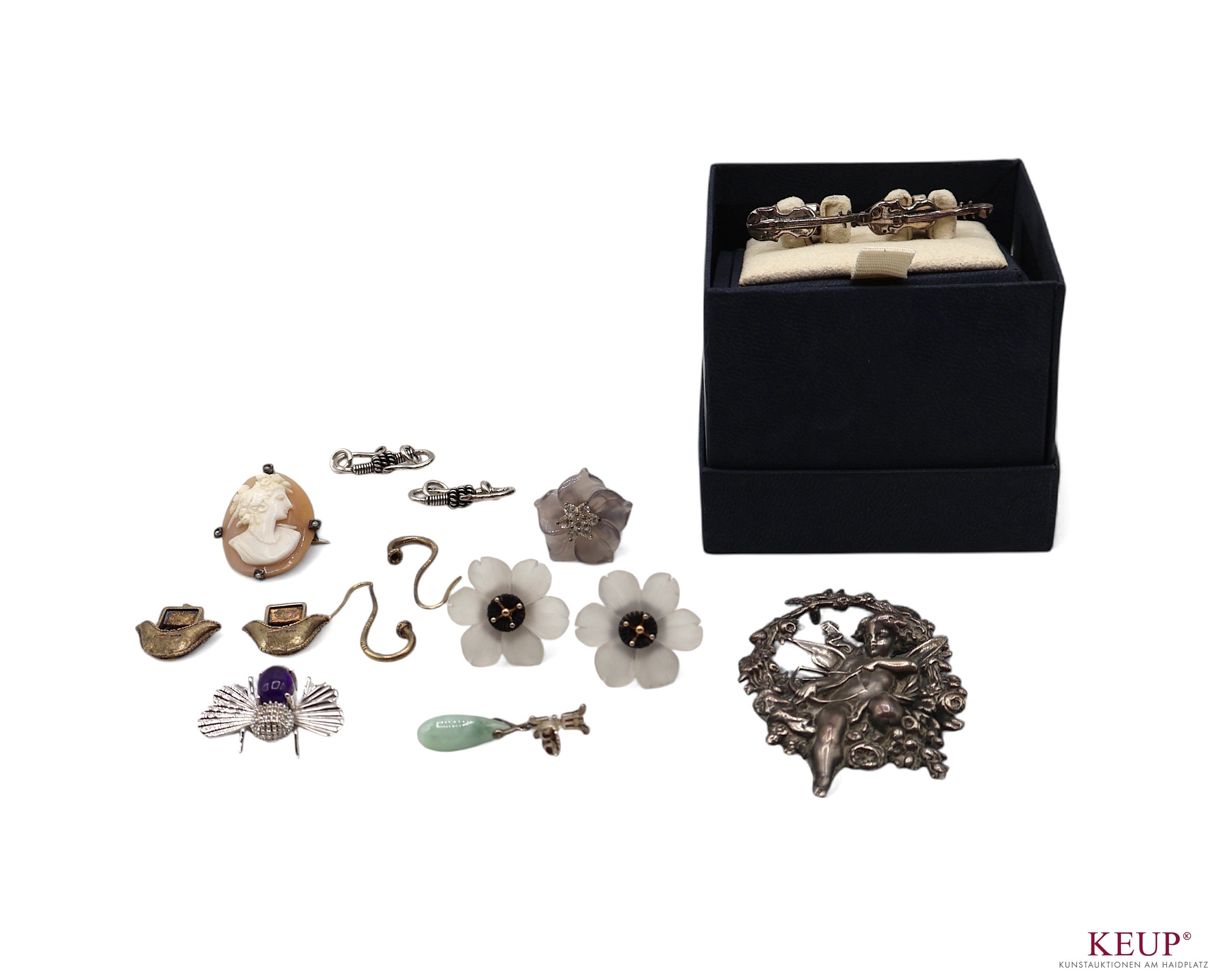 Konvolut Silberschmuck (9) - XX.Jahrhundert Paar englische Manschettenknöpfe in 925 Silber, Brosche mit Amor in 925 Silber, Paar englische Ohrhänger in 925 Silber, Gemme, Bienenbrosche in 925 Silber, Damenring in 925 Silber mit zwei Ohrsteckern, drei einzelne Ohrhänger, Provenienz: Privatbesitz Oberpfalz