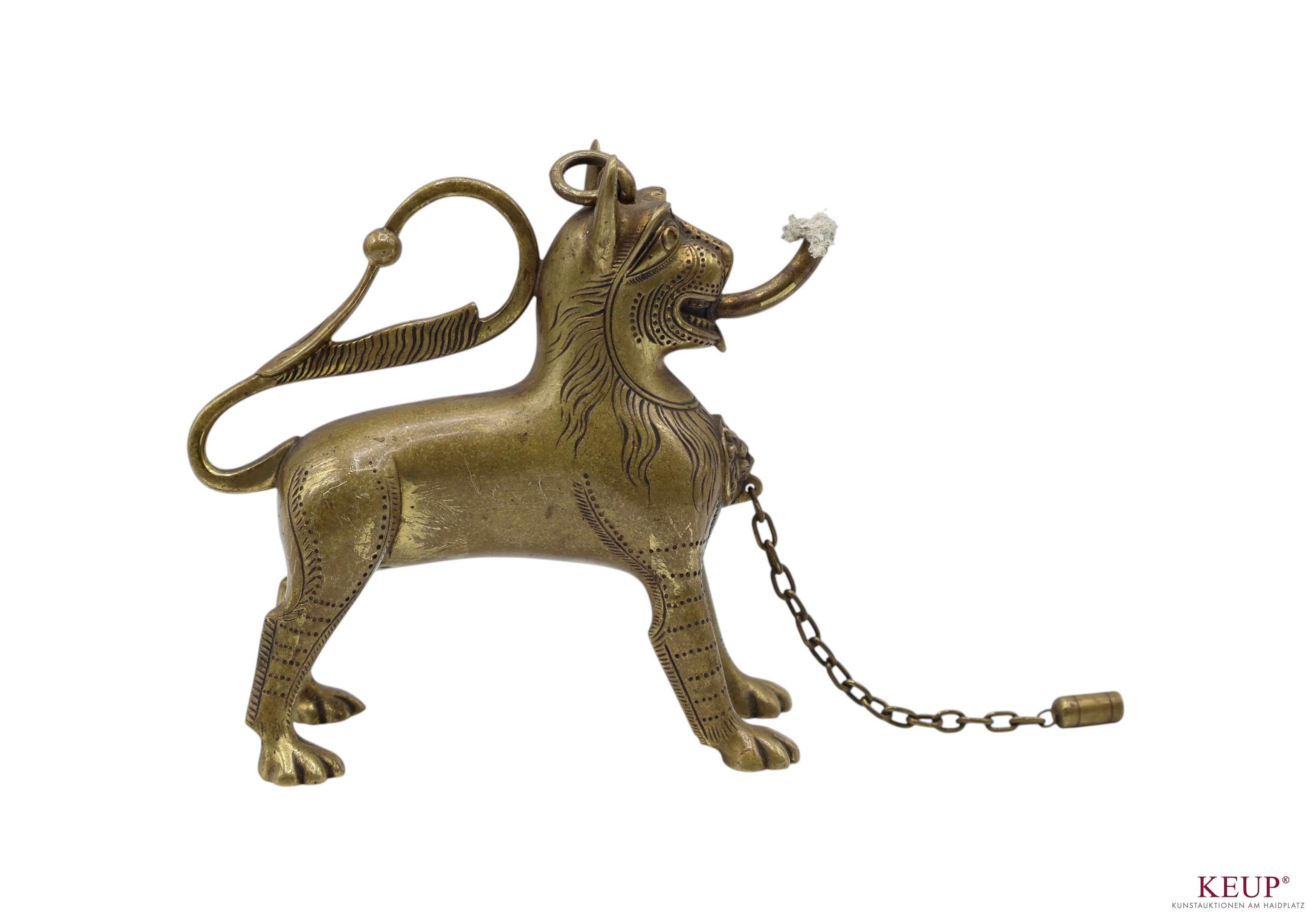 Löwenlampe - wohl Schwäbisch Gmünd Ende 19.Jahrhundert in Form eines mittelalterlichen Aquamaniles, Bronze, Dochthalter mit Kappe an Kette, Maße ca. 14x14x5 cm, Provenienz: Privatbesitz Hamburg aus Regensburg Nachlass