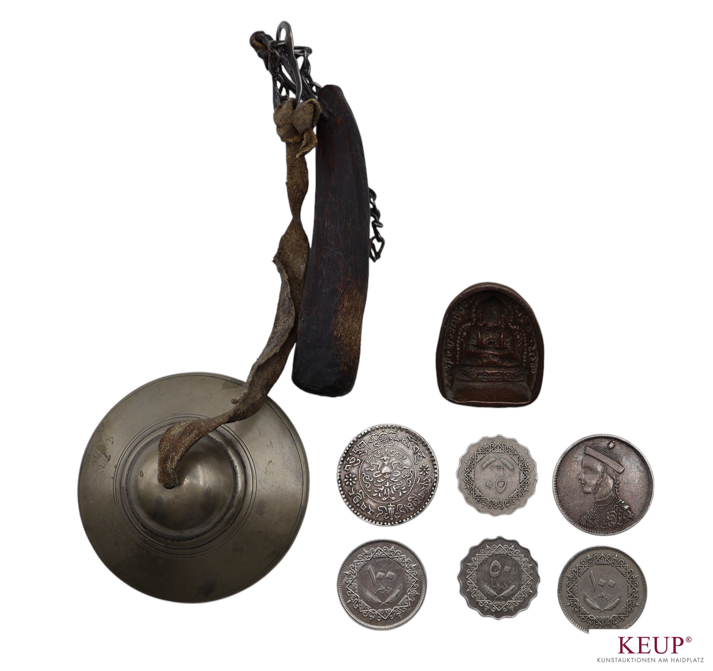 Lot Asiatika 1. Vier Siegel, Messing/Eisen, gravierte Siegelköpfe, 4 Stück, Höhe ca. 3 bis 5,5 cm 2. Zimbel, Tibet, traditionelles Schlaginstrument 3. Buddhistische Votivtafel 4. Münzen: 1 Rupee - In the name of Guangxu, Scrang Tibet (1907-1959) 11 Gr., Münze Dirham Libyen (4 Stück)