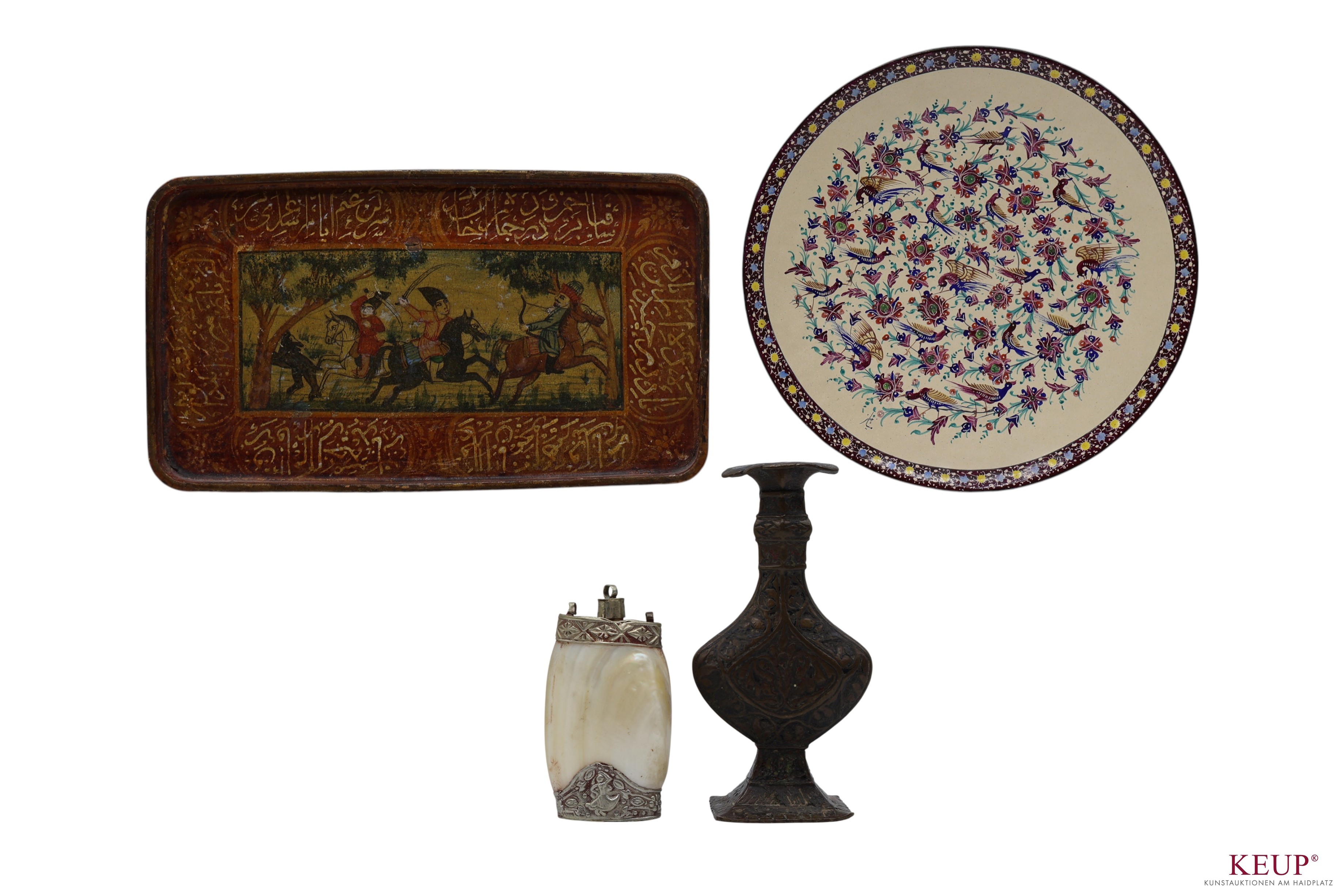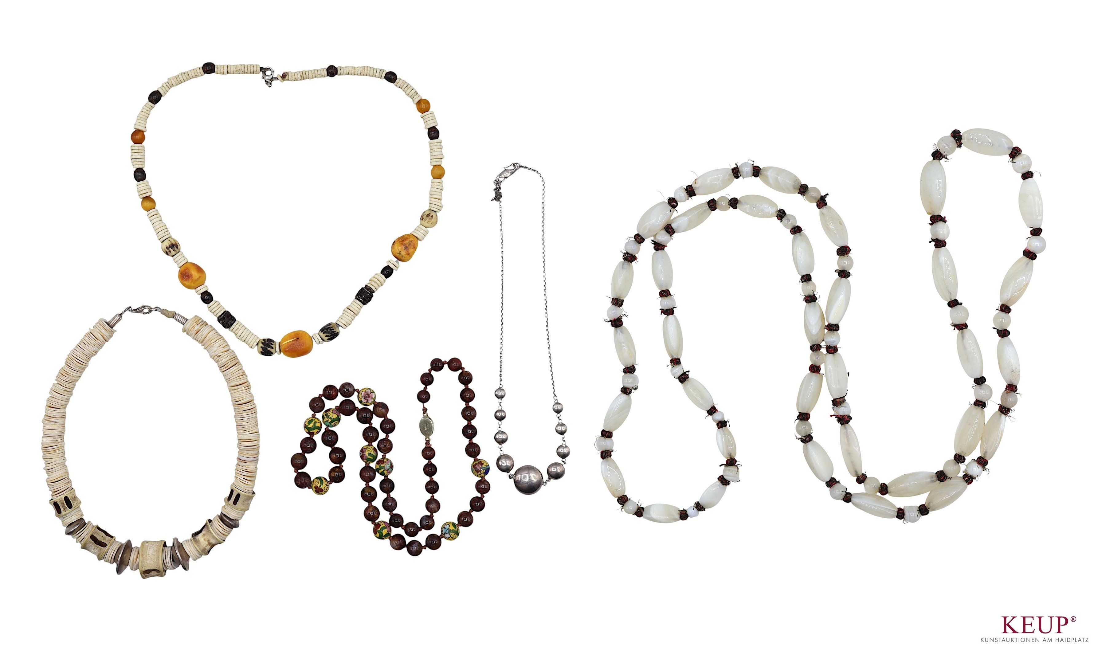Lot Asiatica 1. fünf Ketten (Muschel/Cloisonne/Achat) 2. Riechdose in Perlmutt 3. Emailschale Isfahan 4. kl. Holzschale, bemalt mit Reiterszene, Iran, 5.kl. Vase, Bronze, floral verziert, Provenienz: Privatbesitz Oberbayern