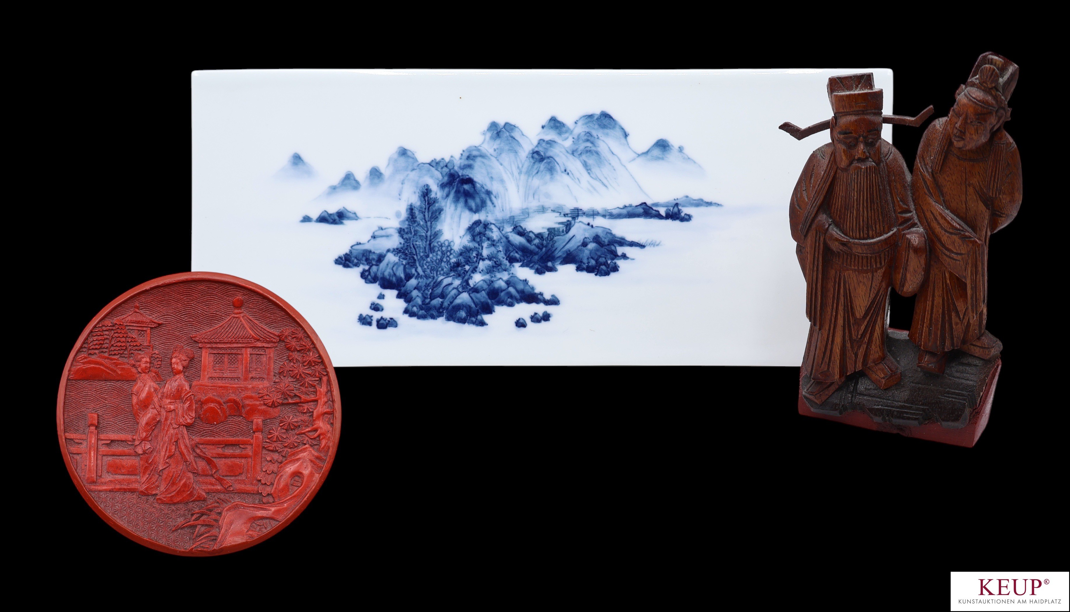 Lot Asiatika bestehend aus: gemarkte Porzellanplakette mit Landschaft, kl. Zinnoberlackschale mit geschnitztem Gartenmotiv, Figurengruppe in Holz geschnitzt, wohl China 20.Jahrhundert, 3 Teile, Provenienz: Privatbesitz Oberbayern