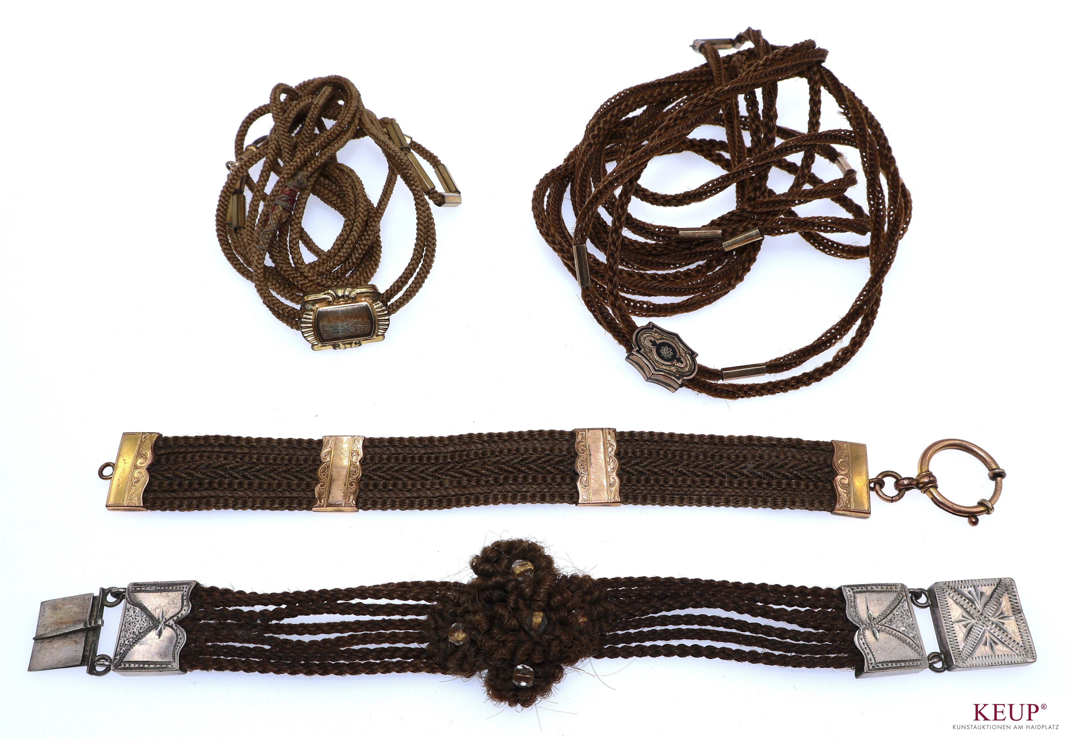Lot Echthaarketten verziert mit Bürgergoldelementen, bestehend aus. Zwei Halsketten und zwei Armbändern, versch. Dekor und Längen, Provenienz: Landkreis Regensburg