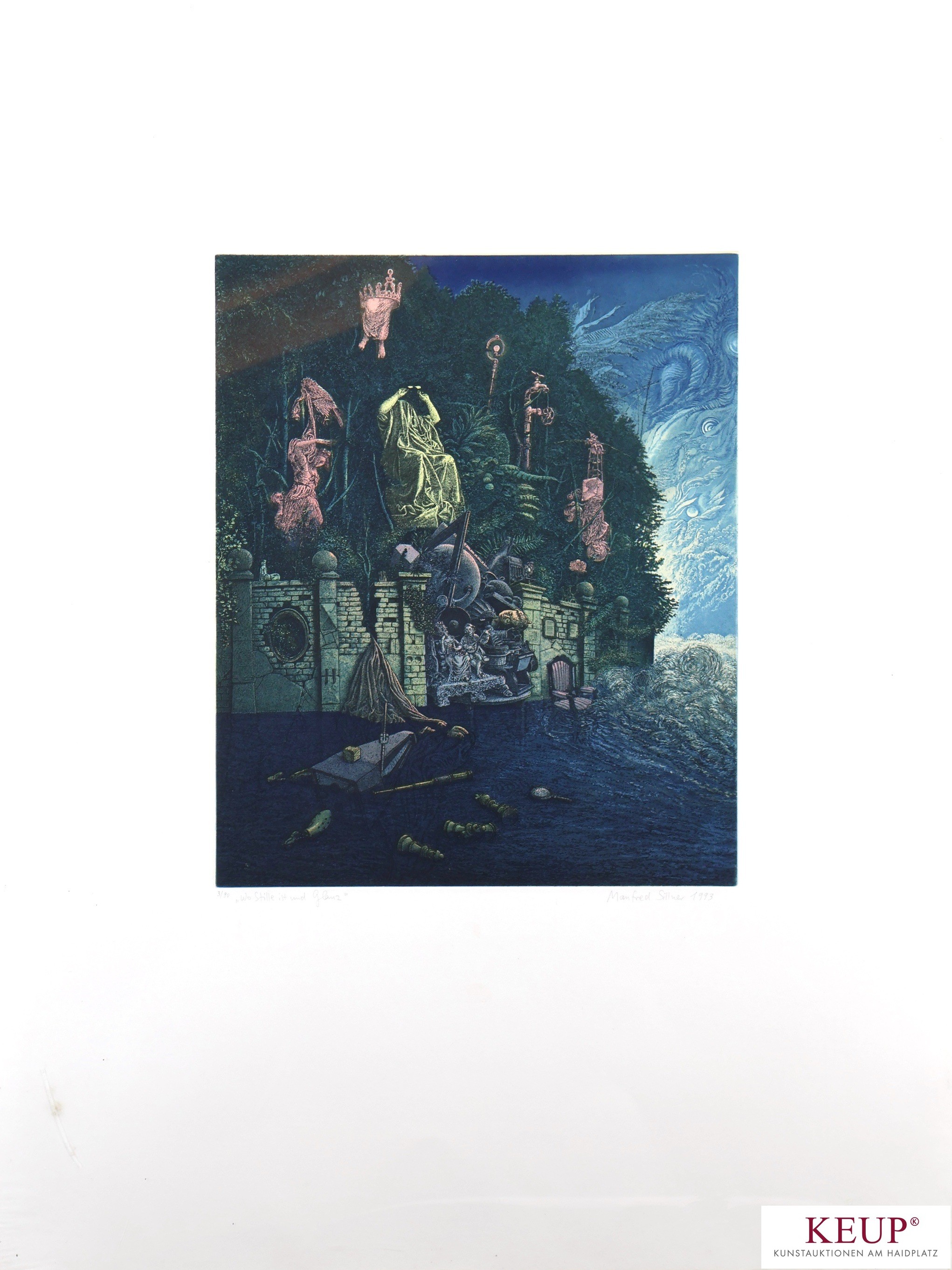 Farbradierung - Manfred Sillner (1937 Berlin) ''Wo Stille ist und Glanz'', r.u. Bleistiftsignatur, datiert 1993, Nr. 3/90, Plattenmaße ca. 39,5x32,5 cm, Blattmaße ca. 80x60 cm, Provenienz: Privater Oberpfälzer Kunstsammlung, vgl. Lit.: 1959-1962 Studium der Pädagogik in Regensburg, bis 1975 Lehrer und Kunsterzieher in Ndb/Opf., daneben 1965-1970 Studium der Malerei und Graphik an der Akademie der Bildenden Künste in München bei M.Zimmermann. Seit 1975 freischaffender Künstler in Berlin, Kelheim, Abensberg, etc., 1972 Kulturförderpreis der Stadt Regensburg, 1993 ''Kulturpreis Ostbayern'' der OBAG Regensburg