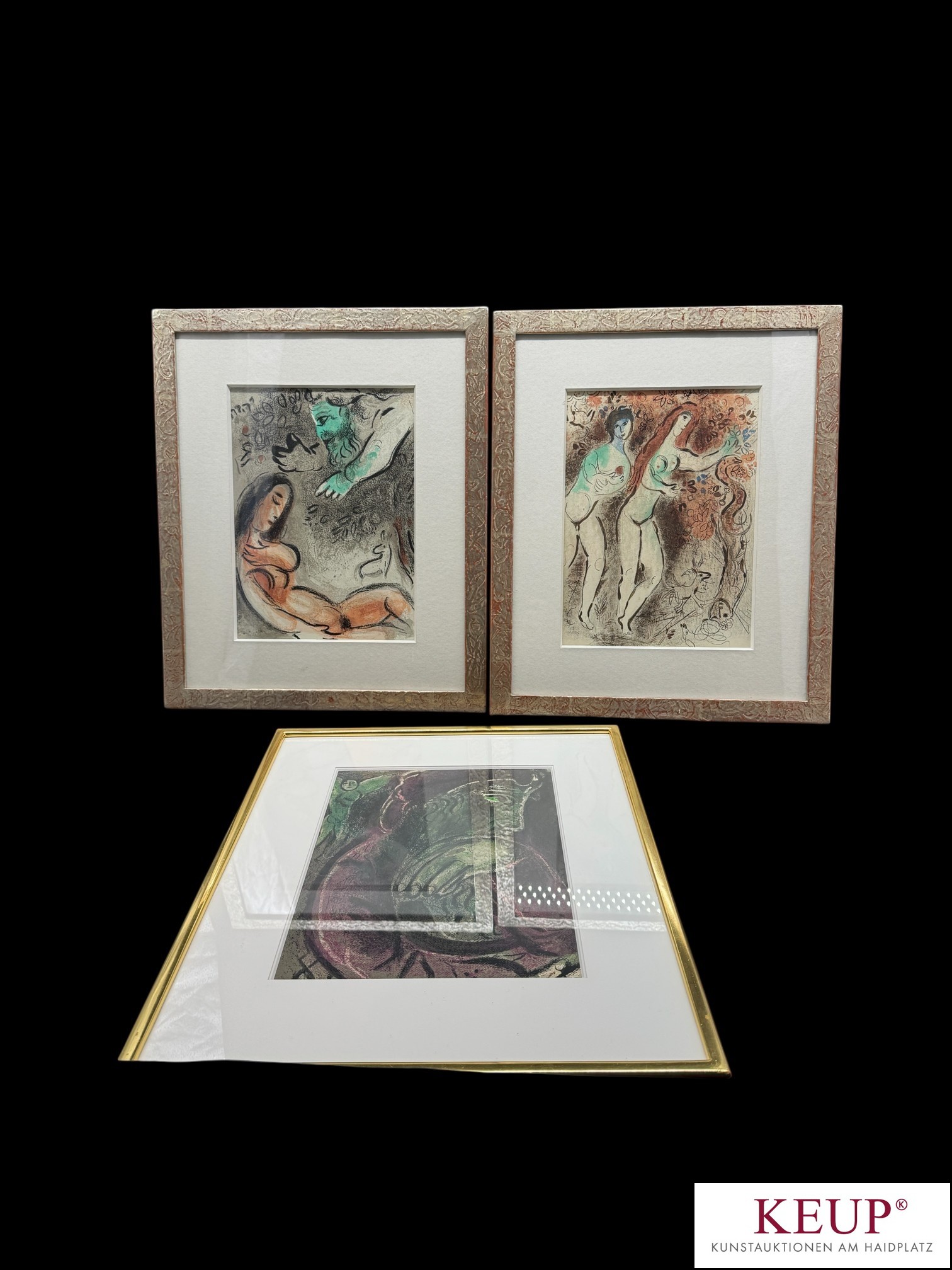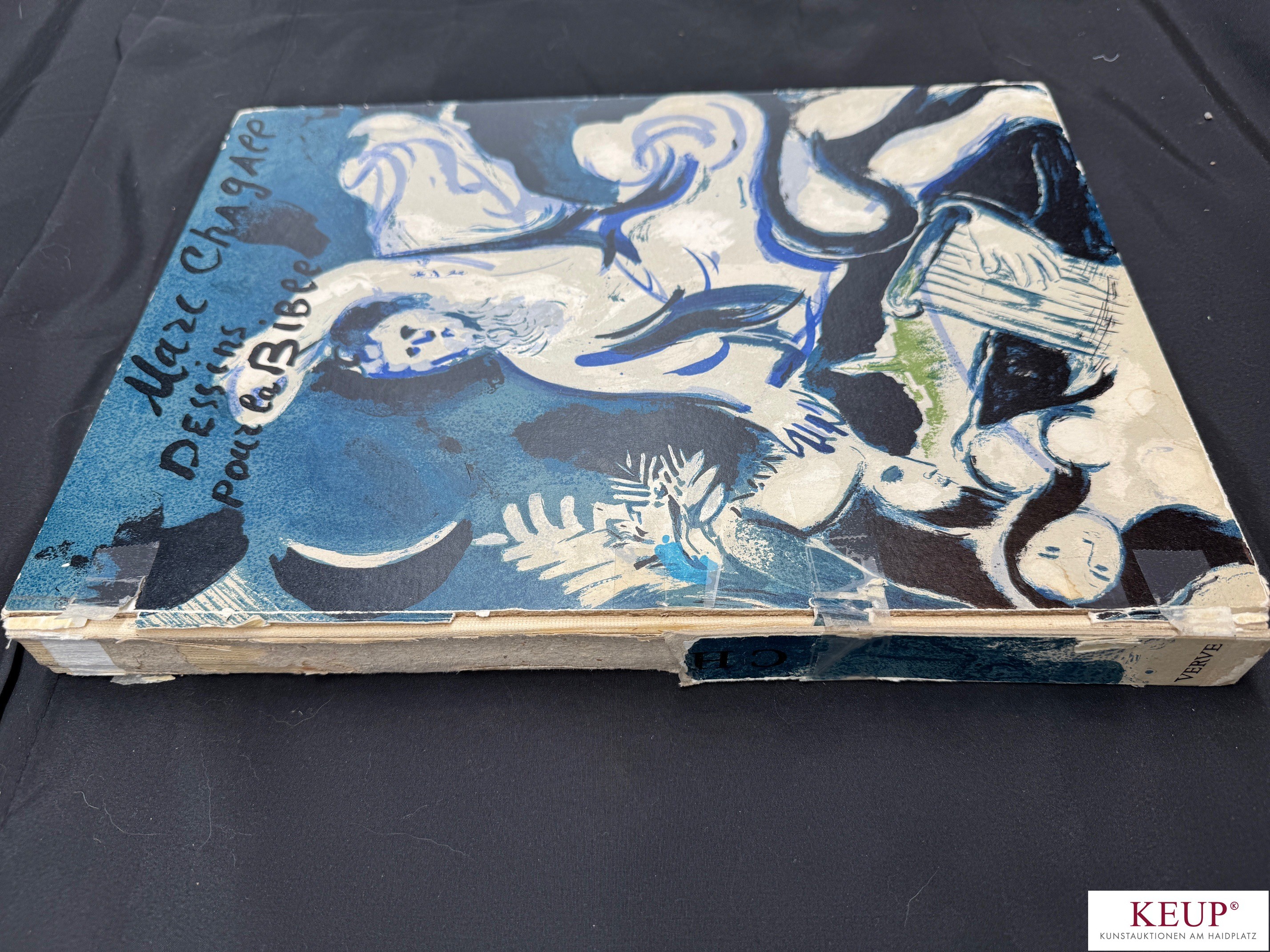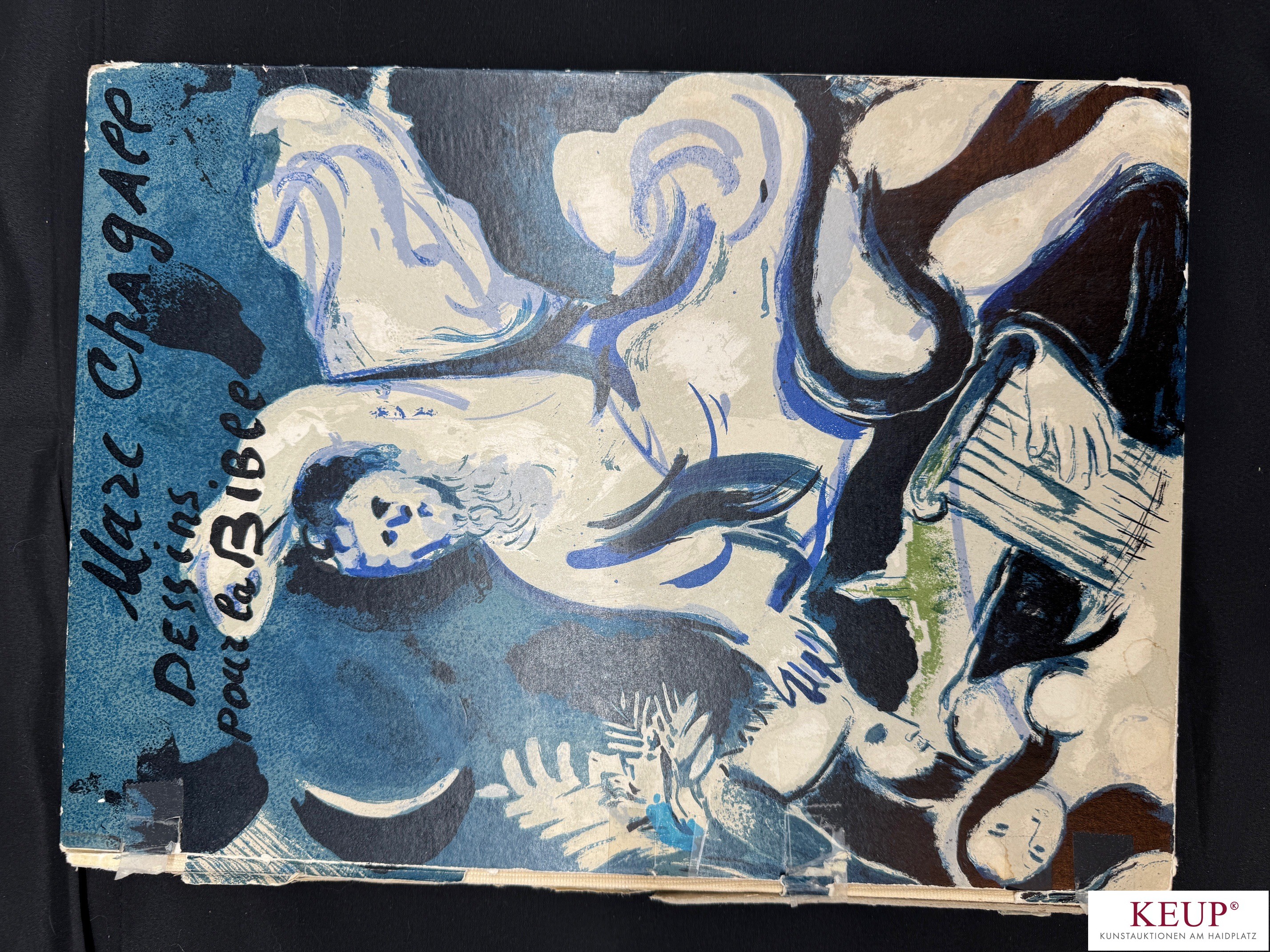 Buch - Marc Chagall (1887-1985) ''Dessins pour la Bible'', Verve Revue Artistique et Litteraire Directeur : Teriade Vol. X, Nos 37 et 38, Editions De la Revue Verve Paris 1960, im Buch 12 Farblithografien und zahlreiche schwarze Reproduktionen (Blätter fehlen, nicht kollationiert), weiterhin anbei drei Grafiken gerahmt: ''Eva wird von Gott verdammt'', ''Hiob in der Verzweiflung'', ''Adam und Eva und die verbotene Frucht'', Maße ca. 36x26,5 cm, Altersspuren (u.a. Buchrücken besch. und geklebt), Provenienz: Privatbesitz Regensburg