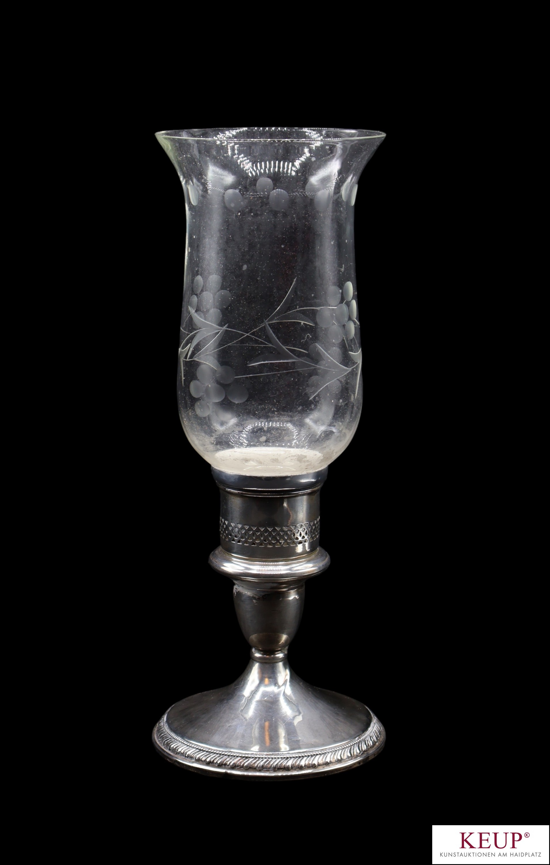 Silbernes Windlicht - Marke Cartier Sterling Silberfuß (gefüllt), mit Glasaufsatz, Höhe ca. 26 cm, Gebrauchsspuren, Provenienz: Privatbesitz Regensburg
