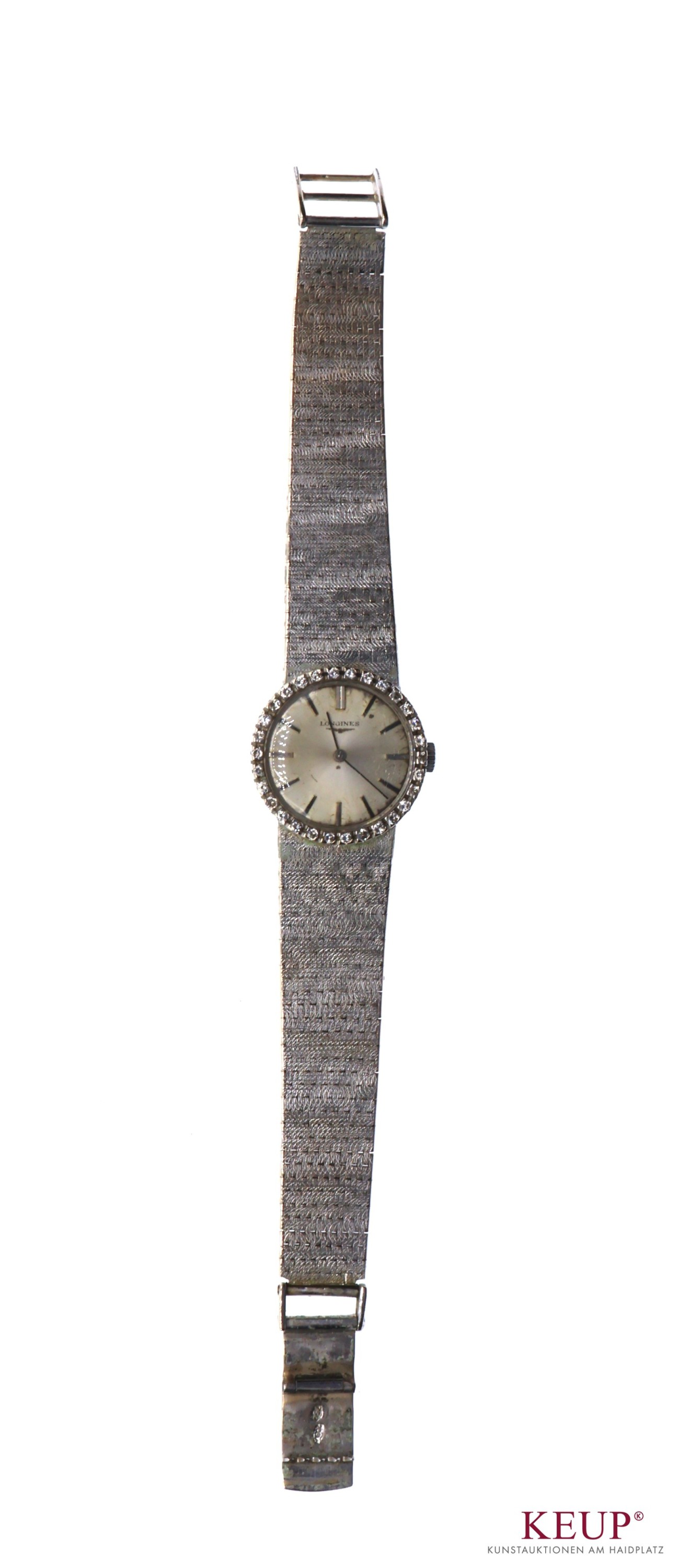 Damenarmbanduhr - Marke Longines rundes Weißgold-Gehäuse gest. 750/18 K, helles Zifferblatt mit Stabindexen (starke Altersspuren), Gehäuse umrandet von kl. Brillanten, Goldarmband gest. 750, mechanisches Werk mit Kronenaufzug, Faltschließe, Länge ca. 17 cm, Uhren werden nicht auf Gangbarkeit geprüft, Provenienz: Privatbesitz Chiemgau