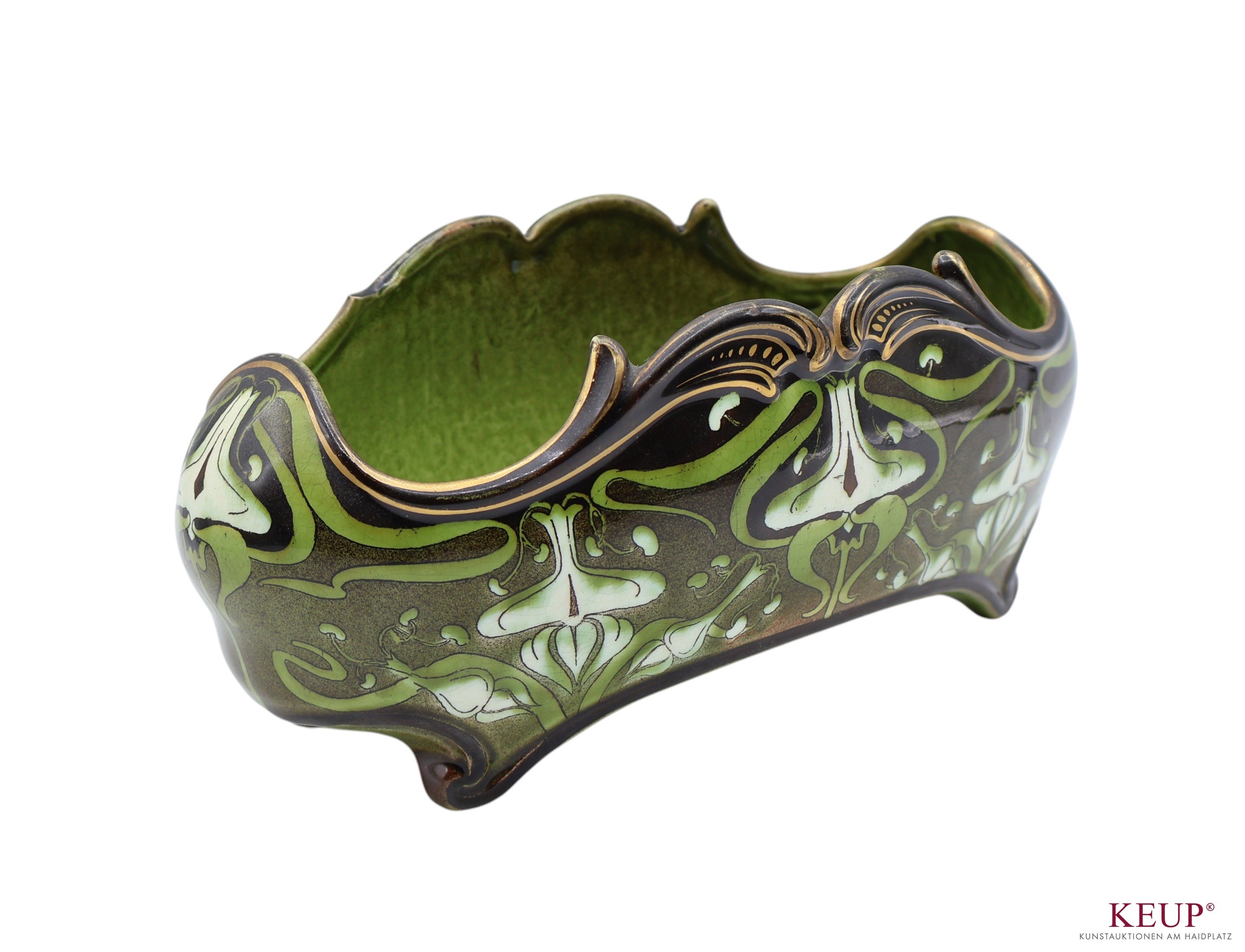 Jugendstilschale - Marke Luneville France KG Nr. 17, grün/grau/weiße Lasur, Länge ca. 22 cm, Höhe ca. 9,5 cm, Provenienz: Privatbesitz Oberpfalz