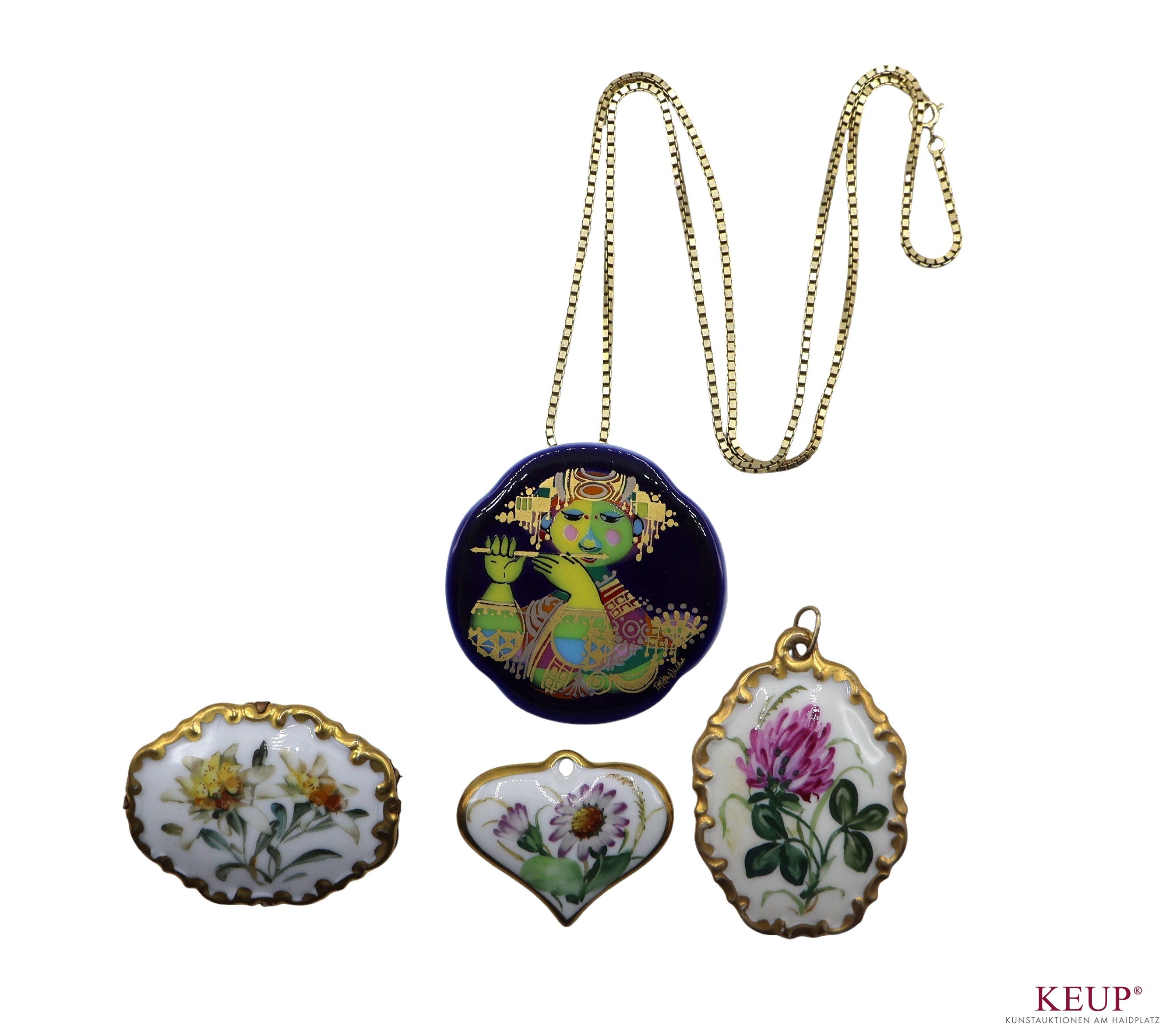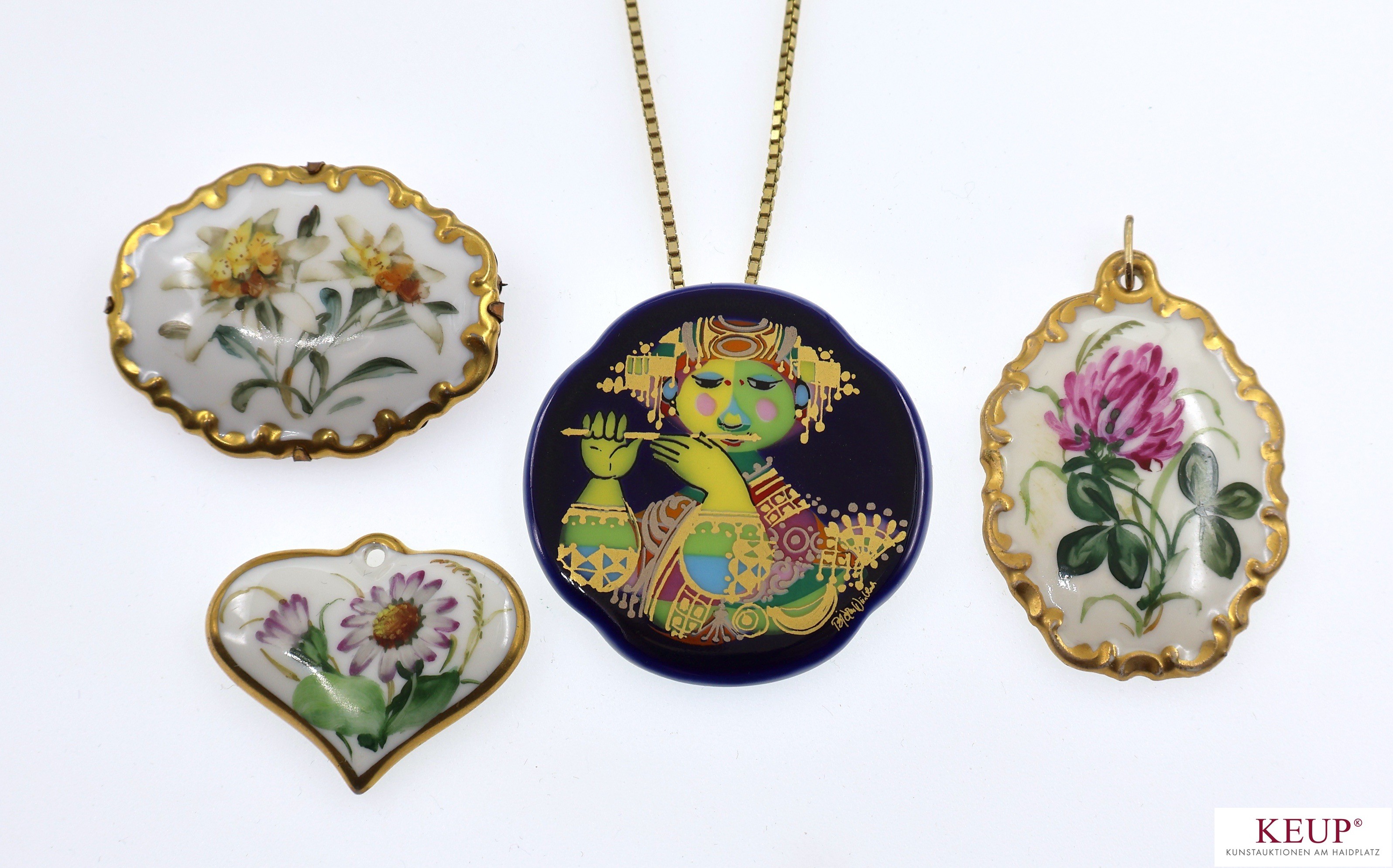Lot Porzellanbroschen - Marke Rosenthal 1. Porzellanplatte mit gold. Montierung an Kette, '' Aladin '', Björn Wiindblad, Porzellan bunt staffiert, Maße ca. 5x5 cm 2. Brosche, '' Blumendekor '', handbemalt, Länge ca. 5 cm 3. Anhänger, '' Blumendekor '', handbemalt, Höhe ca. 5 cm 4. Herzanhänger, handbemalt, Höhe ca. 4 cm, Provenienz: Landkreis Regensburg