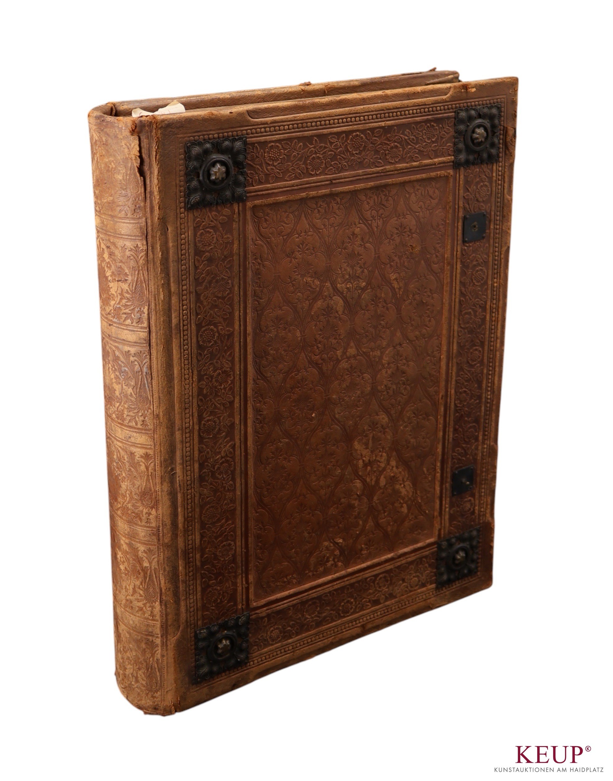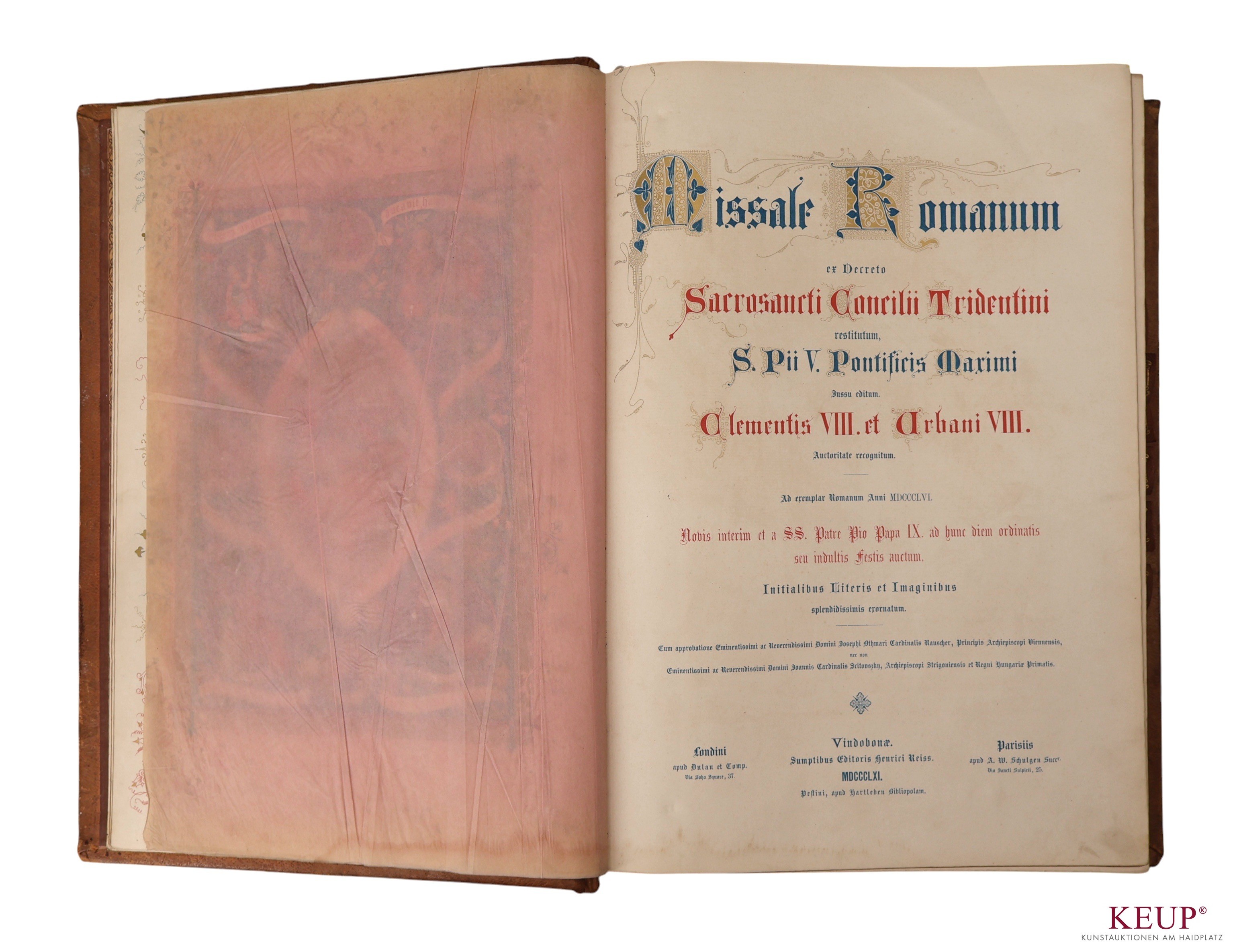 Messbuch ''Missale Romanum ex decreto Sacrosancti Concilii Tridentini restitutum, S. Pii V. Pontificis Maximi Jussu editum, Clementis VIII. et Urbani VIII'', 1856, Druck der Officin von J. Stöckholzer v. Hirschfeld, unter eigener Leitung von Heinr. Reiss, Titelillustration, Ledereinband geprägt mit Messingrosetten, nicht kollationiert, Maße ca. 44x33 cm, Provenienz: Regensburg