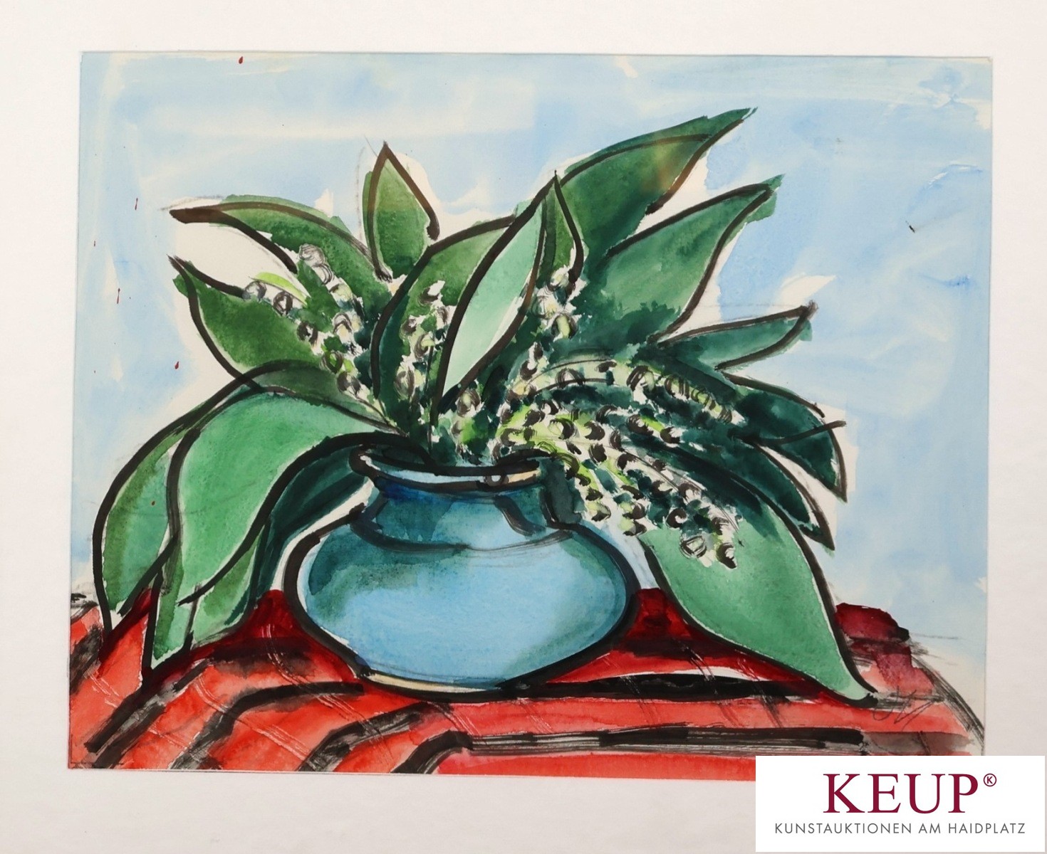 Aquarell - Otto Baumann (Regensburg 1901 - 1992) ''Maiglöckchen in Vase'', r.u. Monogramm, lasierende Farben auf Papier, Maße Darstellung ca. 32x40 cm, Passepartout, Provenienz: Privatbesitz aus Oberpfalz, vgl. Lit.: Maler und Graphiker, Studium an der Kölner und Münchner Akademie der Bildenden Künste, Studienaufenthalt in Paris an der Académie Colarossi, 1930 wieder in München, Fortsetzung des Studiums bis 1934 mit dem Wintersemester bei Carl Caspar. Ab 1934 freischaffender Künstler in Oberndorf bei Bad Abbach, versch. Preise und Ausstellungen, u.a. Kulturpreis Regensburg, Kulturpreis Ostbayern, Kulturförderpreis der Stadt Rgbg, Albertus-Magnus Medaille, etc.,