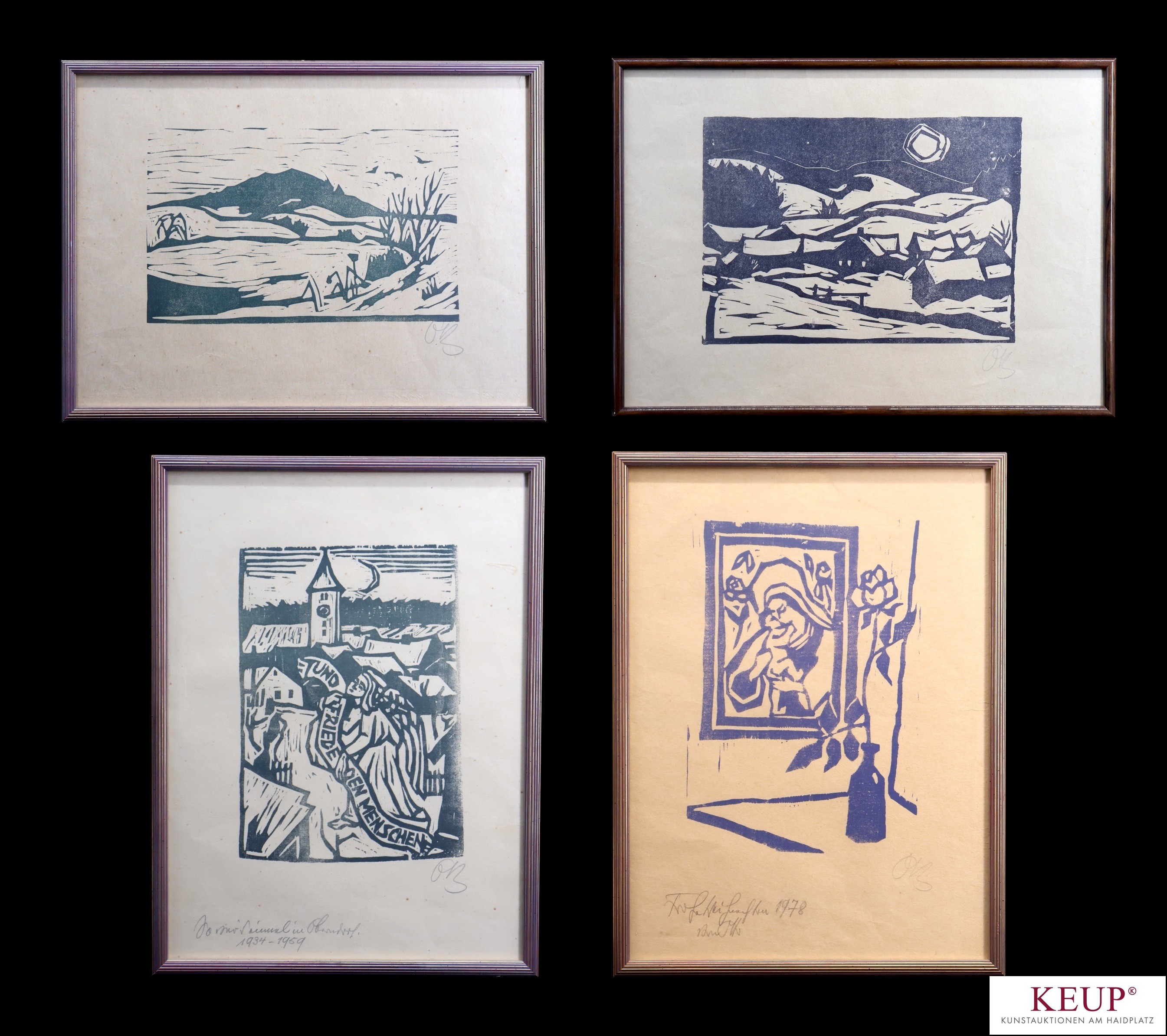 Lot Grafiken- Otto Baumann (Regensburg 1901 - 1992) verschiedene Ansichten und Größen, Bleistiftmonogramm, Altersspuren, Rahmen, 4 Stück, Provenienz: Privatbesitz aus Regensburg, vgl. Lit.: Maler und Graphiker, Studium an der Kölner und Münchner Akademie der Bildenden Künste, Studienaufenthalt in Paris an der Académie Colarossi, 1930 wieder in München, Fortsetzung des Studiums bis 1934 mit dem Wintersemester bei Carl Caspar. Ab 1934 freischaffender Künstler in Oberndorf bei Bad Abbach, versch. Preise und Ausstellungen, u.a. Kulturpreis Regensburg, Kulturpreis Ostbayern, Kulturförderpreis der Stadt Rgbg, Albertus-Magnus Medaille, etc.,