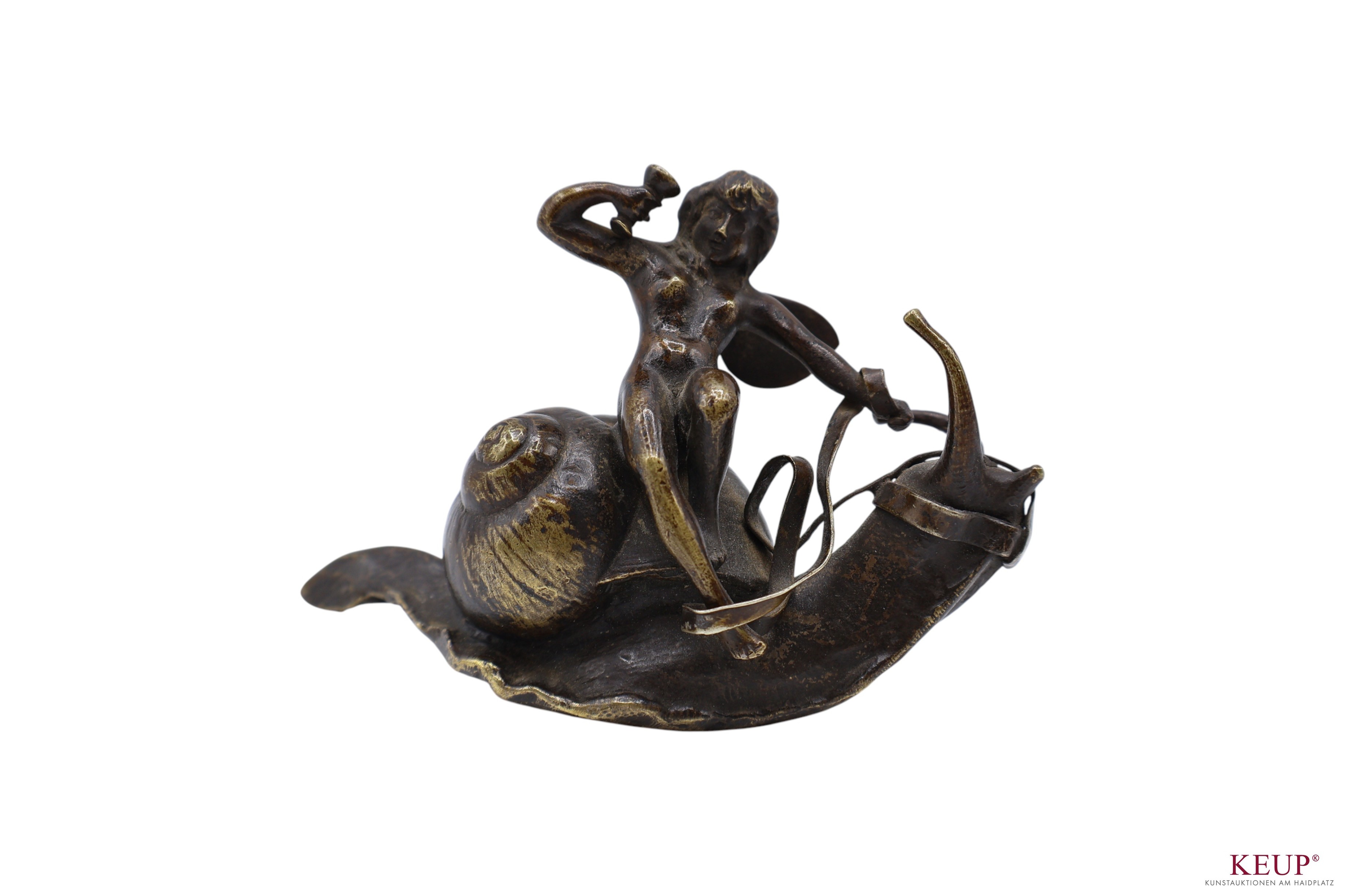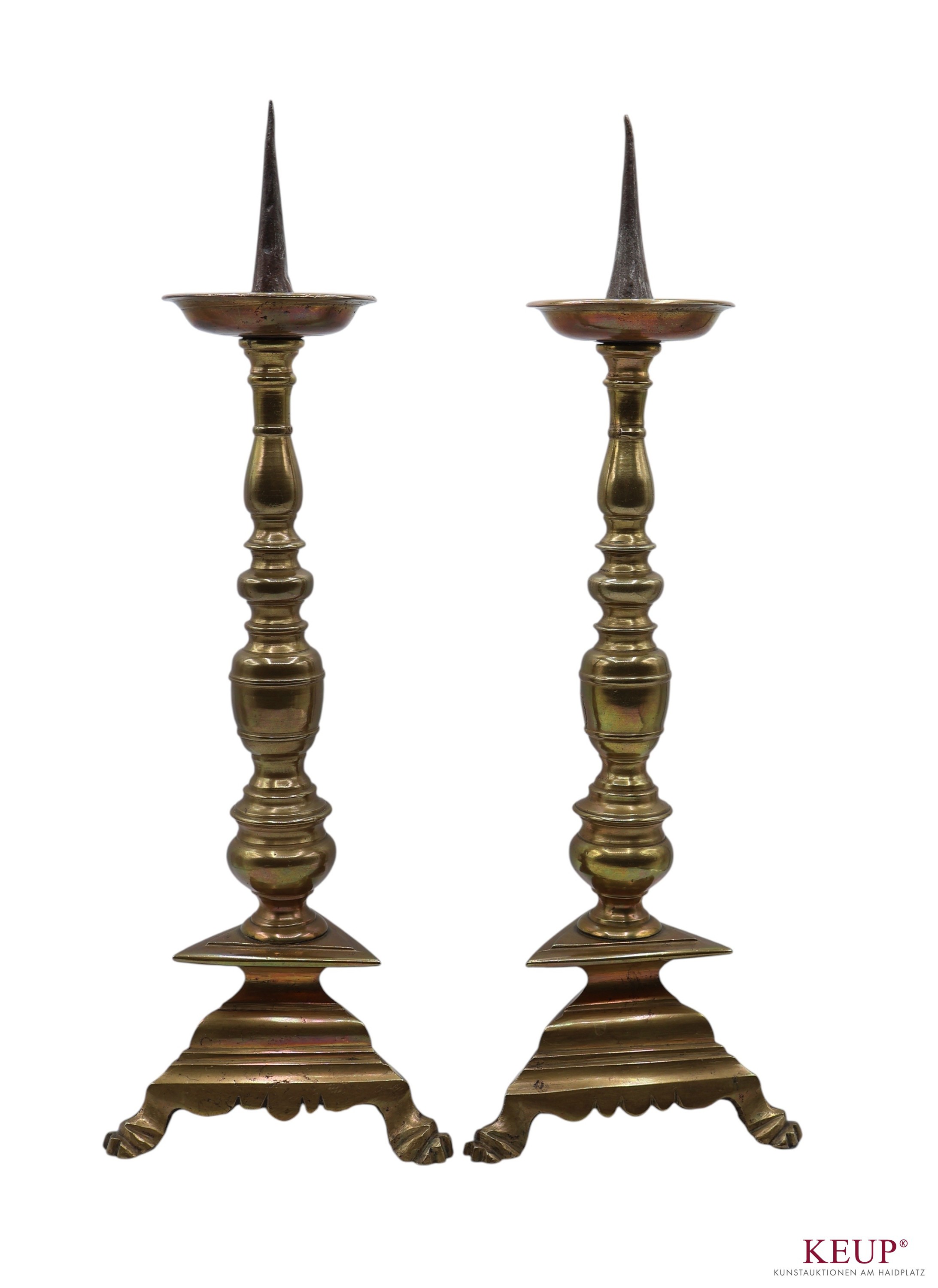 Paar barocke Kerzenleuchter - wohl Italien Bronze, dreipassiger Fuß mit Tatzenfüßen, gegliederter Schaft, 1-flammig, Höhe ca. 41 cm (mit Dorn), anbei kleine Bronze, Nymphe auf Schnecke (1.Flügel fehlt), signiert Geppert, Provenienz: Privatbesitz Hamburg aus Regensburger Nachlass