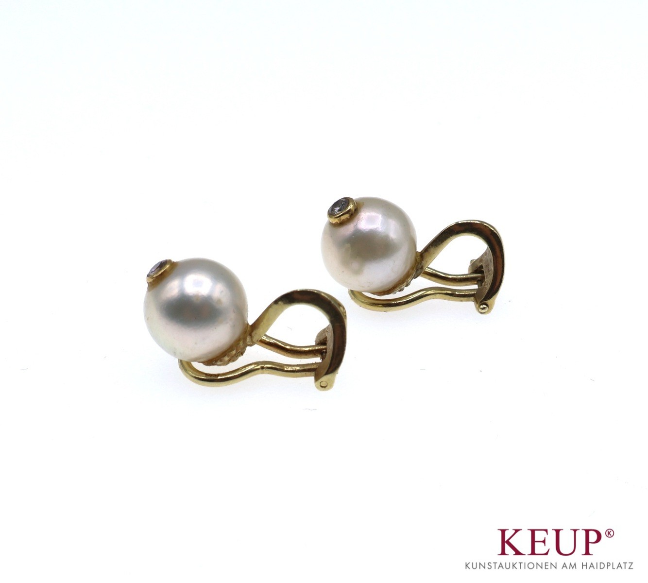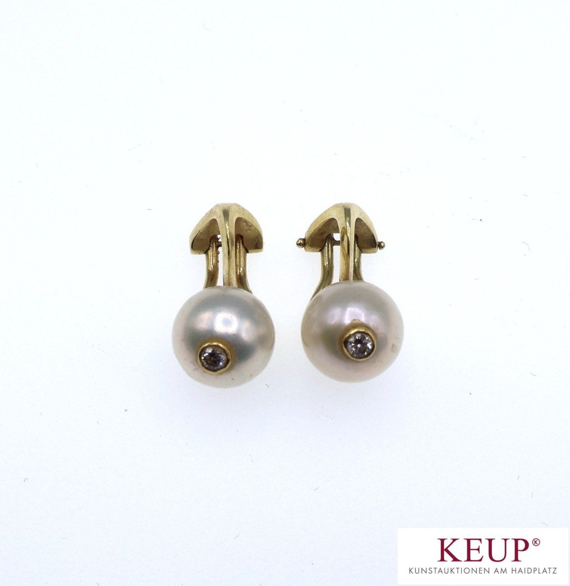 Paar goldene Ohrclips - XX.Jahrhundert mit Perle und kleinem Brillant, Gelbgold gest. 585, Provenienz: Privatbesitz Regensburg