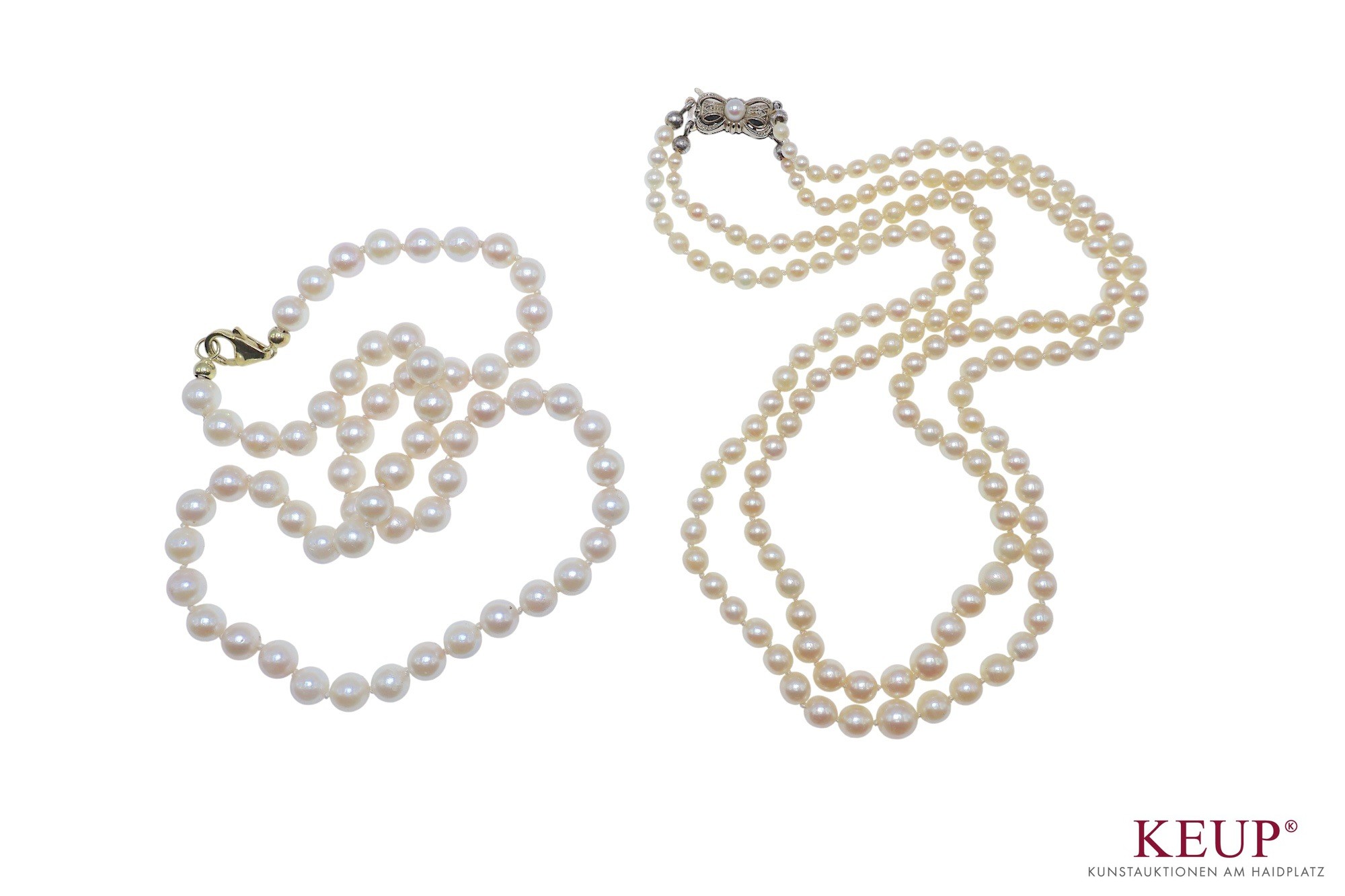 Paar Perlenketten 1. Perlenkette mit 60 Perlen, Goldverschluss gest. 585, Gesamtlänge ca. 46 cm 2. Perlenkette, 2-reihig, zulaufend, Verschluss gest. 585, verziert mit einer Perle, Gesamtlänge ca. 43 cm, Provenienz: Landkreis Regensburg
