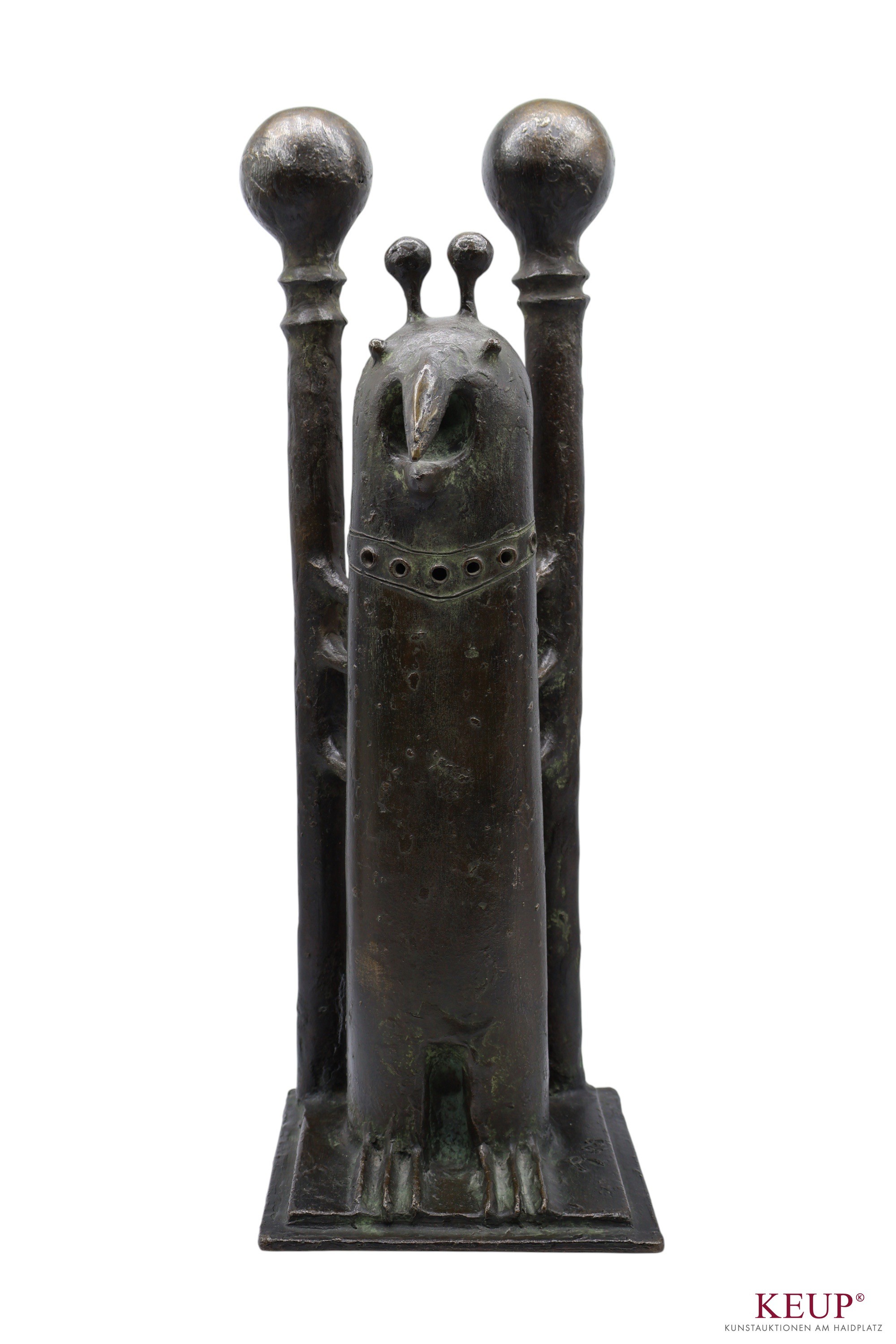 Große Figur - Peter Mayer (1938 Schwandorf / Bayern 2009) ''Fabelwesen'', monogrammiert und datiert (19)88, Bronze, ca. 9,90 kg, Höhe 45 cm, Provenienz: Private Oberpfälzer Kunstsammlung vgl. Literatur: Staatl. Fachschule für Keramik in Landshut, 1958-64 Akademie der Bildenden Künste München, seit 1964 freischaffender Bildhauer in Schwandorf 1974 Ostbayerischer Kulturpreis OBAG 1991, 94, 98 Stipendium und Aufenthalt im V.C.C.A, USA Ausstellungen: 1975 Miami Beach, I.C.S. Conv. 1976 Galerie Bürdecke, Zürich 1977 Kunstmesse Köln, Kunsthaus Lübeck 1978 Galerie Sphinx, Amsterdam 1984 Tassilo Galerie, Nürnberg 1984 Galerie im DEZ, Regensburg 1985 Galerie Lange Straße, Baden-Baden 1988 Oberpfälzer Künstlerhaus, Schwandorf 1992 Musée des Beaux-Arts, Libourne 1997 St. Anna Kapelle, Passau 1998 Kleine Galerie, Regensburg 1999 Kapuziner Stadl, Deggendorf Öffentliche Ankäufe / Kunst im öffentlichen Raum: Museum der Stadt Regensburg, Bay. Staatsgemäldesammlung München Universität Regensburg, Bezirk Oberpfalz, viele Arbeiten im öffentlichen Raum