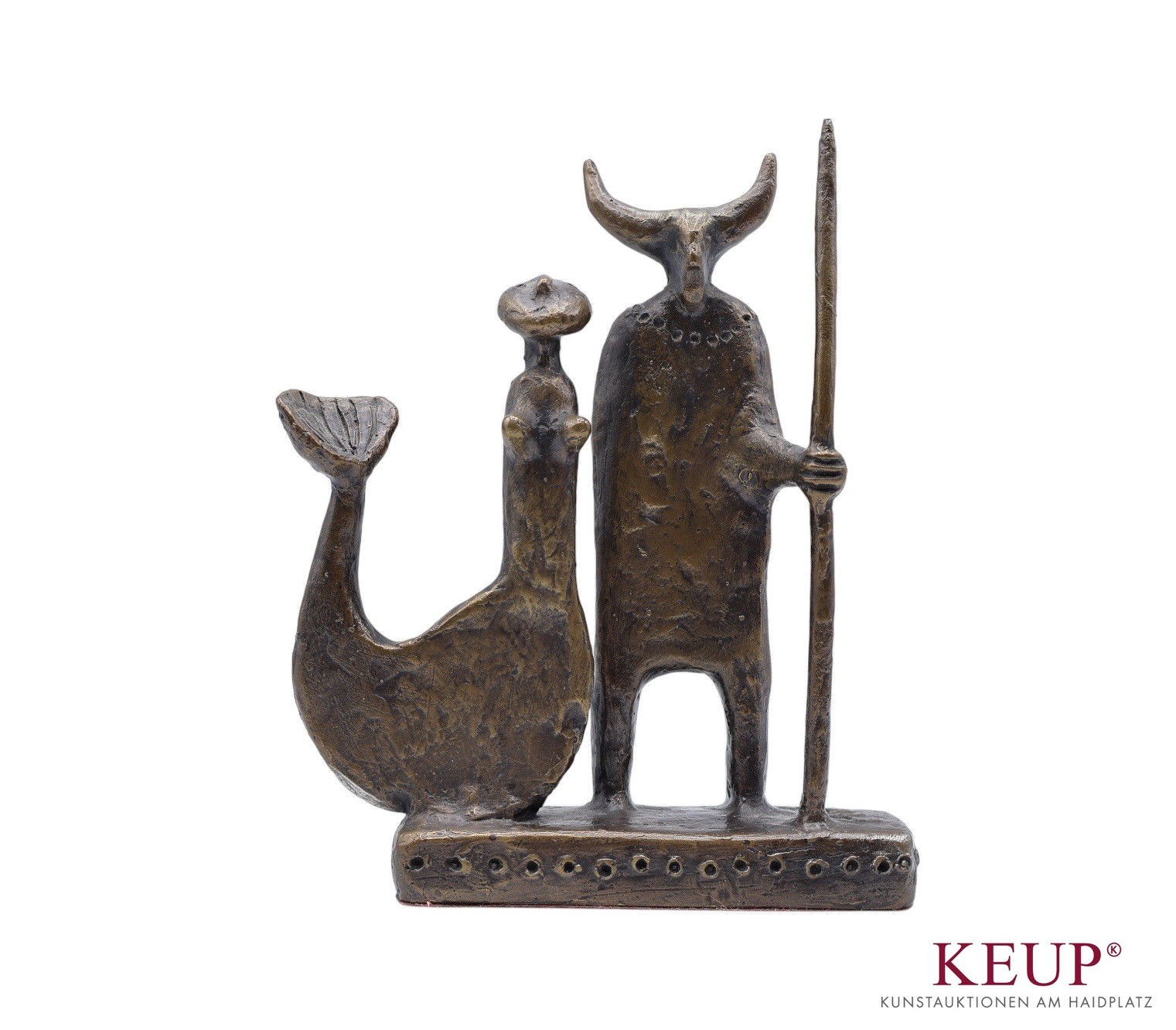 Figurengruppe - Peter Mayer (1938 Schwandorf / Bayern 2009) ''Fabelwesen'', monogrammiert und datiert (19)89, Bronze, Höhe 15 cm, Provenienz: Private Oberpfälzer Kunstsammlung vgl. Literatur: Staatl. Fachschule für Keramik in Landshut, 1958-64 Akademie der Bildenden Künste München, seit 1964 freischaffender Bildhauer in Schwandorf 1974 Ostbayerischer Kulturpreis OBAG 1991, 94, 98 Stipendium und Aufenthalt im V.C.C.A, USA Ausstellungen: 1975 Miami Beach, I.C.S. Conv. 1976 Galerie Bürdecke, Zürich 1977 Kunstmesse Köln, Kunsthaus Lübeck 1978 Galerie Sphinx, Amsterdam 1984 Tassilo Galerie, Nürnberg 1984 Galerie im DEZ, Regensburg 1985 Galerie Lange Straße, Baden-Baden 1988 Oberpfälzer Künstlerhaus, Schwandorf 1992 Musée des Beaux-Arts, Libourne 1997 St. Anna Kapelle, Passau 1998 Kleine Galerie, Regensburg 1999 Kapuziner Stadl, Deggendorf Öffentliche Ankäufe / Kunst im öffentlichen Raum: Museum der Stadt Regensburg, Bay. Staatsgemäldesammlung München Universität Regensburg, Bezirk Oberpfalz, viele Arbeiten im öffentlichen Raum
