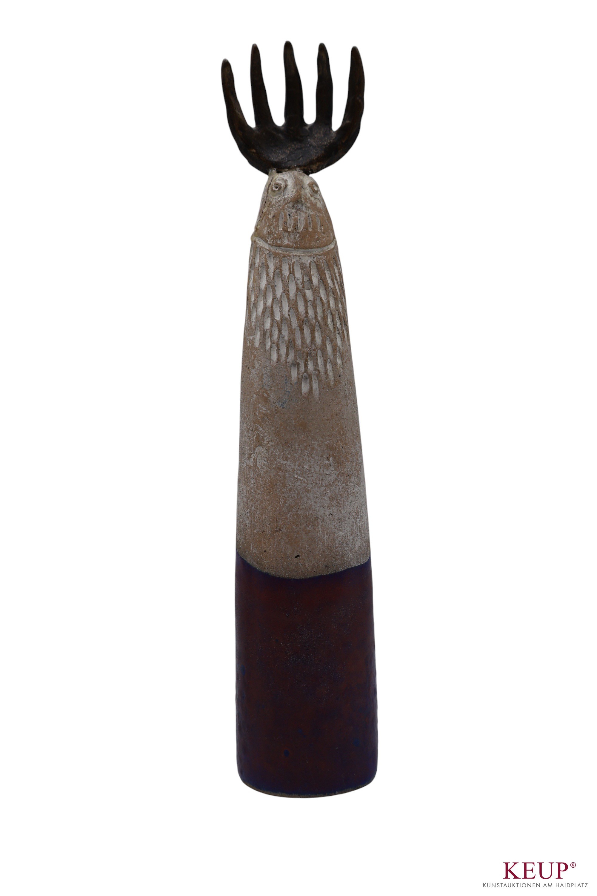 Paar Figuren - Peter Mayer (1938 Schwandorf / Bayern 2009) ''Fabelwesen'', monogrammiert und datiert (19)90, Terrakotta und Bronze, Höhe ca. 17 und 18,5 cm, 2 Stück, Provenienz: Private Oberpfälzer Kunstsammlung vgl. Literatur: Staatl. Fachschule für Keramik in Landshut, 1958-64 Akademie der Bildenden Künste München, seit 1964 freischaffender Bildhauer in Schwandorf 1974 Ostbayerischer Kulturpreis OBAG 1991, 94, 98 Stipendium und Aufenthalt im V.C.C.A, USA Ausstellungen: 1975 Miami Beach, I.C.S. Conv. 1976 Galerie Bürdecke, Zürich 1977 Kunstmesse Köln, Kunsthaus Lübeck 1978 Galerie Sphinx, Amsterdam 1984 Tassilo Galerie, Nürnberg 1984 Galerie im DEZ, Regensburg 1985 Galerie Lange Straße, Baden-Baden 1988 Oberpfälzer Künstlerhaus, Schwandorf 1992 Musée des Beaux-Arts, Libourne 1997 St. Anna Kapelle, Passau 1998 Kleine Galerie, Regensburg 1999 Kapuziner Stadl, Deggendorf Öffentliche Ankäufe / Kunst im öffentlichen Raum: Museum der Stadt Regensburg, Bay. Staatsgemäldesammlung München Universität Regensburg, Bezirk Oberpfalz, viele Arbeiten im öffentlichen Raum