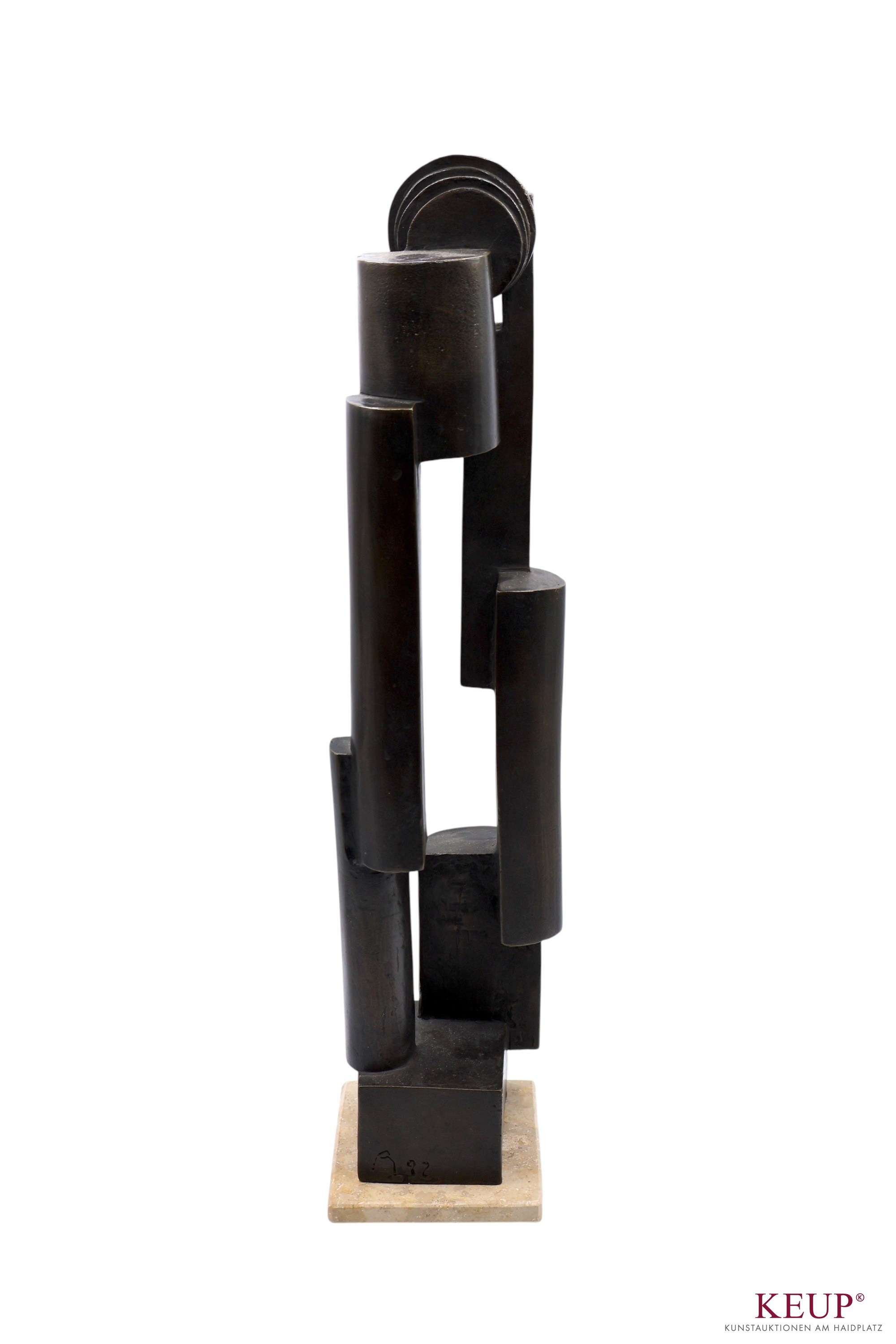 Figur - Peter Mayer (1938 Schwandorf / Bayern 2009) ''Ohne Titel'', monogrammiert und datiert (19)9, Bronze, Höhe ca. 43 cm, ca. 4,3 kg, Provenienz: Private Oberpfälzer Kunstsammlung vgl. Literatur: Staatl. Fachschule für Keramik in Landshut, 1958-64 Akademie der Bildenden Künste München, seit 1964 freischaffender Bildhauer in Schwandorf 1974 Ostbayerischer Kulturpreis OBAG 1991, 94, 98 Stipendium und Aufenthalt im V.C.C.A, USA Ausstellungen: 1975 Miami Beach, I.C.S. Conv. 1976 Galerie Bürdecke, Zürich 1977 Kunstmesse Köln, Kunsthaus Lübeck 1978 Galerie Sphinx, Amsterdam 1984 Tassilo Galerie, Nürnberg 1984 Galerie im DEZ, Regensburg 1985 Galerie Lange Straße, Baden-Baden 1988 Oberpfälzer Künstlerhaus, Schwandorf 1992 Musée des Beaux-Arts, Libourne 1997 St. Anna Kapelle, Passau 1998 Kleine Galerie, Regensburg 1999 Kapuziner Stadl, Deggendorf Öffentliche Ankäufe / Kunst im öffentlichen Raum: Museum der Stadt Regensburg, Bay. Staatsgemäldesammlung München Universität Regensburg, Bezirk Oberpfalz, viele Arbeiten im öffentlichen Raum