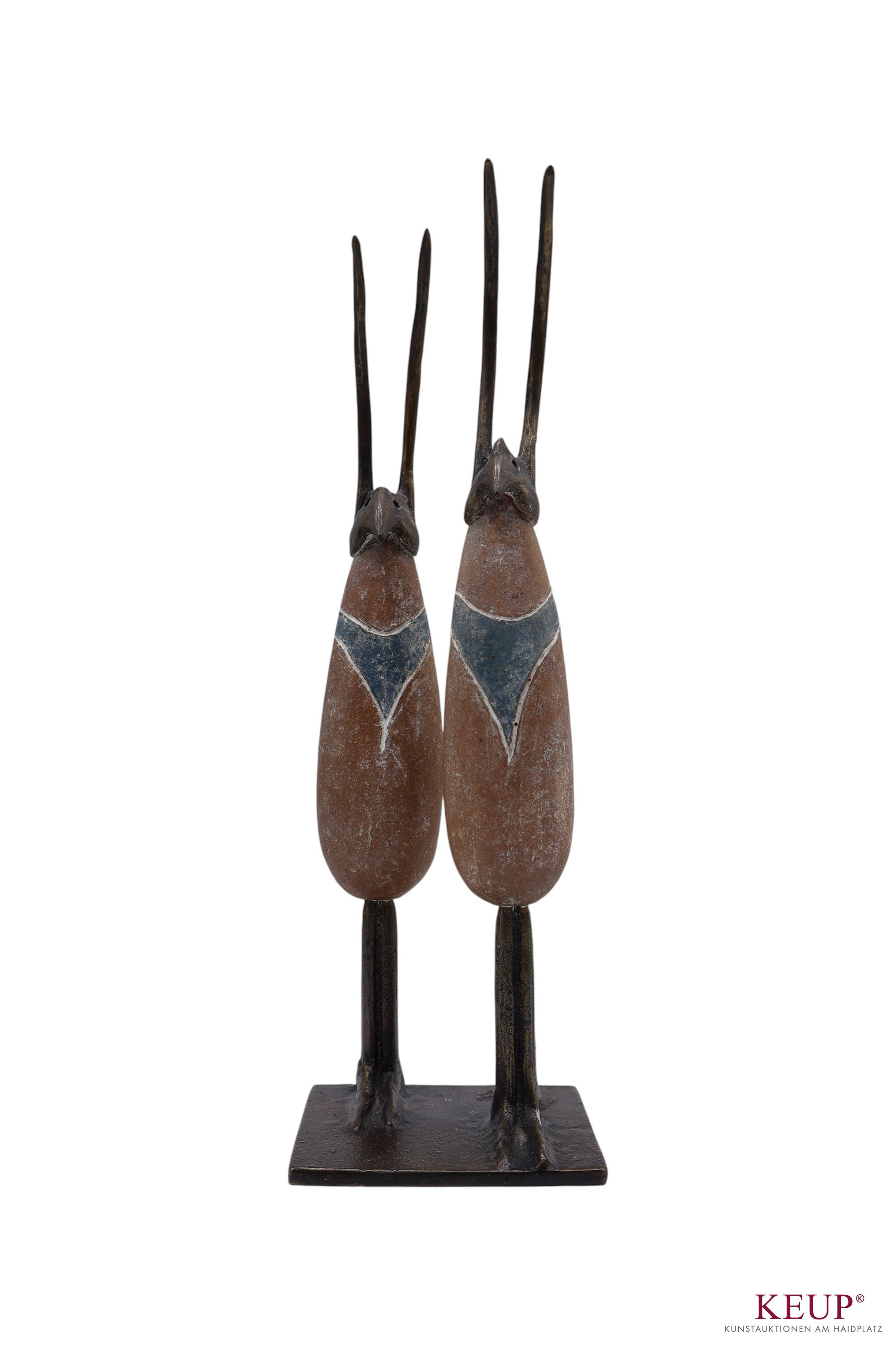 Figurengruppe - Peter Mayer (1938 Schwandorf / Bayern 2009) ''Vogelwächter'', monogrammiert und datiert (19)86, Bronze und Terrakotta, Höhe ca. 28,5 cm, Provenienz: Private Oberpfälzer Kunstsammlung vgl. Literatur: Staatl. Fachschule für Keramik in Landshut, 1958-64 Akademie der Bildenden Künste München, seit 1964 freischaffender Bildhauer in Schwandorf 1974 Ostbayerischer Kulturpreis OBAG 1991, 94, 98 Stipendium und Aufenthalt im V.C.C.A, USA Ausstellungen: 1975 Miami Beach, I.C.S. Conv. 1976 Galerie Bürdecke, Zürich 1977 Kunstmesse Köln, Kunsthaus Lübeck 1978 Galerie Sphinx, Amsterdam 1984 Tassilo Galerie, Nürnberg 1984 Galerie im DEZ, Regensburg 1985 Galerie Lange Straße, Baden-Baden 1988 Oberpfälzer Künstlerhaus, Schwandorf 1992 Musée des Beaux-Arts, Libourne 1997 St. Anna Kapelle, Passau 1998 Kleine Galerie, Regensburg 1999 Kapuziner Stadl, Deggendorf Öffentliche Ankäufe / Kunst im öffentlichen Raum: Museum der Stadt Regensburg, Bay. Staatsgemäldesammlung München Universität Regensburg, Bezirk Oberpfalz, viele Arbeiten im öffentlichen Raum