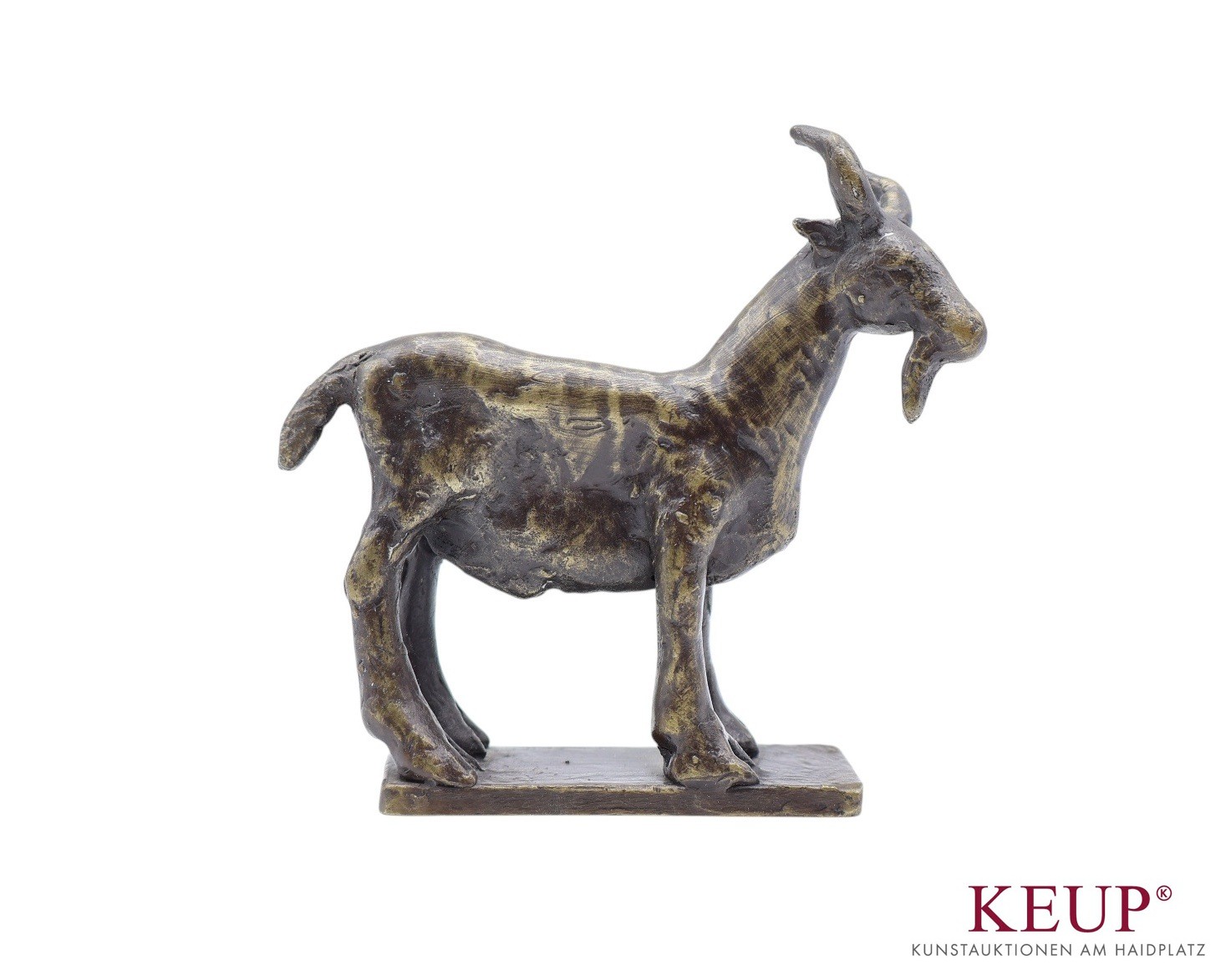 Paar Figuren - Peter Mayer (1938 Schwandorf / Bayern 2009) ''Fabelwesen und Ziegenbock'', monogrammiert und datiert (19)85 und 2000, Bronze, Höhe ca. 9,5 und 11 cm, 2 Stück, Provenienz: Private Oberpfälzer Kunstsammlung vgl. Literatur: Staatl. Fachschule für Keramik in Landshut, 1958-64 Akademie der Bildenden Künste München, seit 1964 freischaffender Bildhauer in Schwandorf 1974 Ostbayerischer Kulturpreis OBAG 1991, 94, 98 Stipendium und Aufenthalt im V.C.C.A, USA Ausstellungen: 1975 Miami Beach, I.C.S. Conv. 1976 Galerie Bürdecke, Zürich 1977 Kunstmesse Köln, Kunsthaus Lübeck 1978 Galerie Sphinx, Amsterdam 1984 Tassilo Galerie, Nürnberg 1984 Galerie im DEZ, Regensburg 1985 Galerie Lange Straße, Baden-Baden 1988 Oberpfälzer Künstlerhaus, Schwandorf 1992 Musée des Beaux-Arts, Libourne 1997 St. Anna Kapelle, Passau 1998 Kleine Galerie, Regensburg 1999 Kapuziner Stadl, Deggendorf Öffentliche Ankäufe / Kunst im öffentlichen Raum: Museum der Stadt Regensburg, Bay. Staatsgemäldesammlung München Universität Regensburg, Bezirk Oberpfalz, viele Arbeiten im öffentlichen Raum
